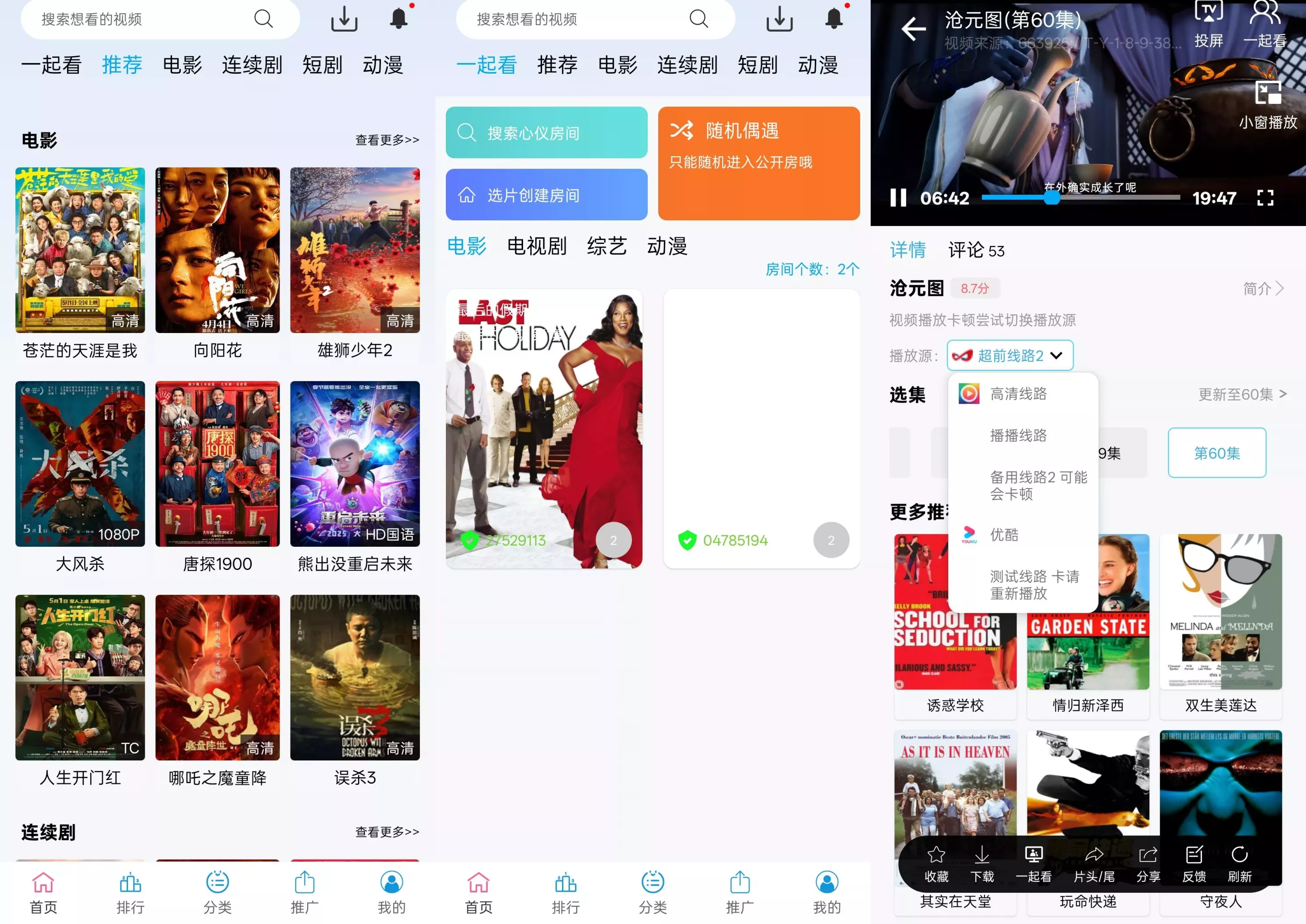独创“一起看”功能打破传统观影孤独感,用户可随机进入公开房间,与天南海北的影迷实时同步追剧,弹幕互动、剧情讨论一键开启。更有投屏功能支持将内容投送至电视大屏,家庭影院级体验触手可及。