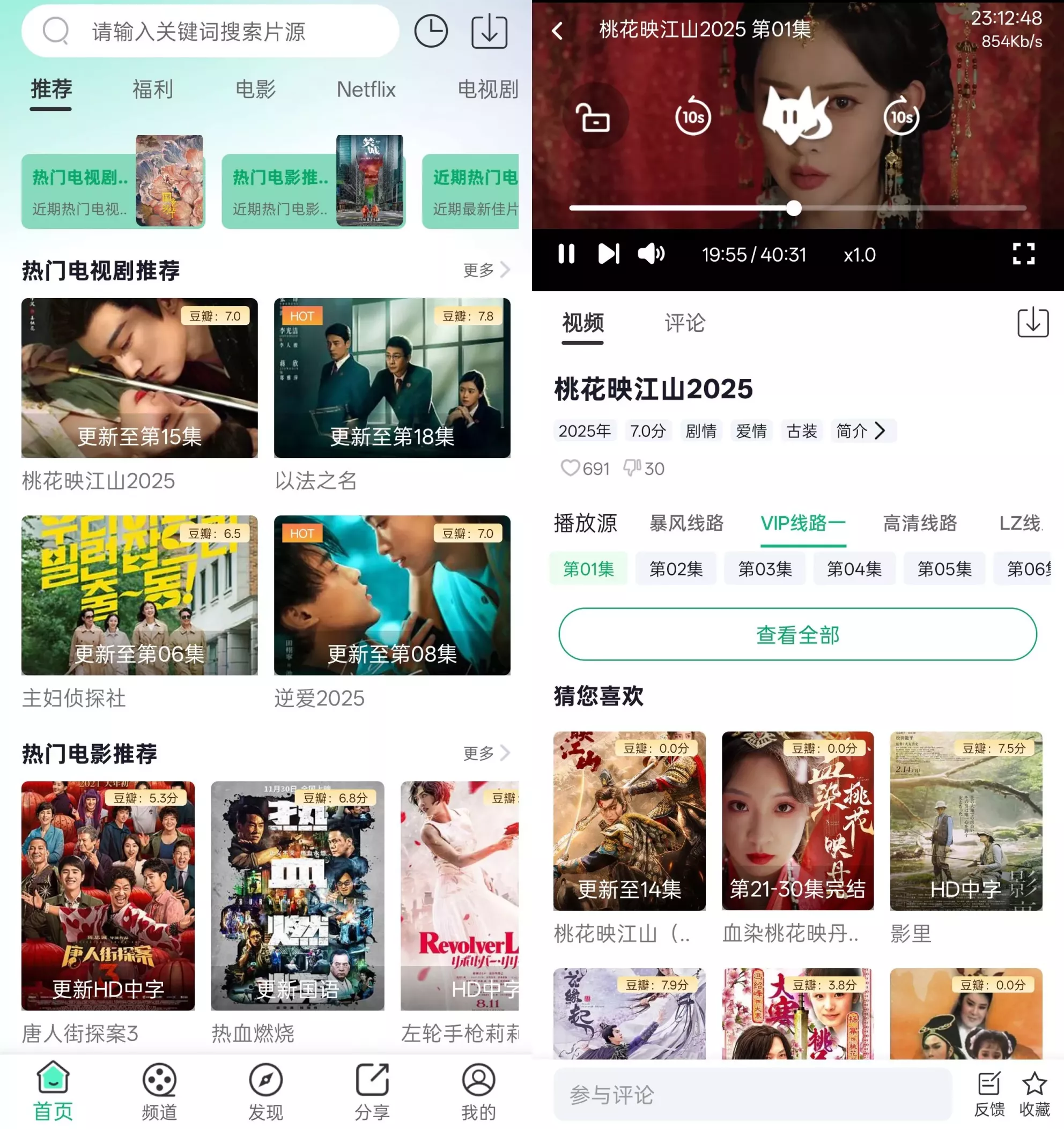 更新及时,片源不断:番茄影视App紧跟影视动态,及时更新最新影片和剧集,如《以法之名》更新至第06集,《主妇侦探社》更新至第18集,确保用户始终能够观看到最新内容。同时,提供多种片源选择,包括暴风线路、VIP线路、高清线路等,保障观影流畅度。