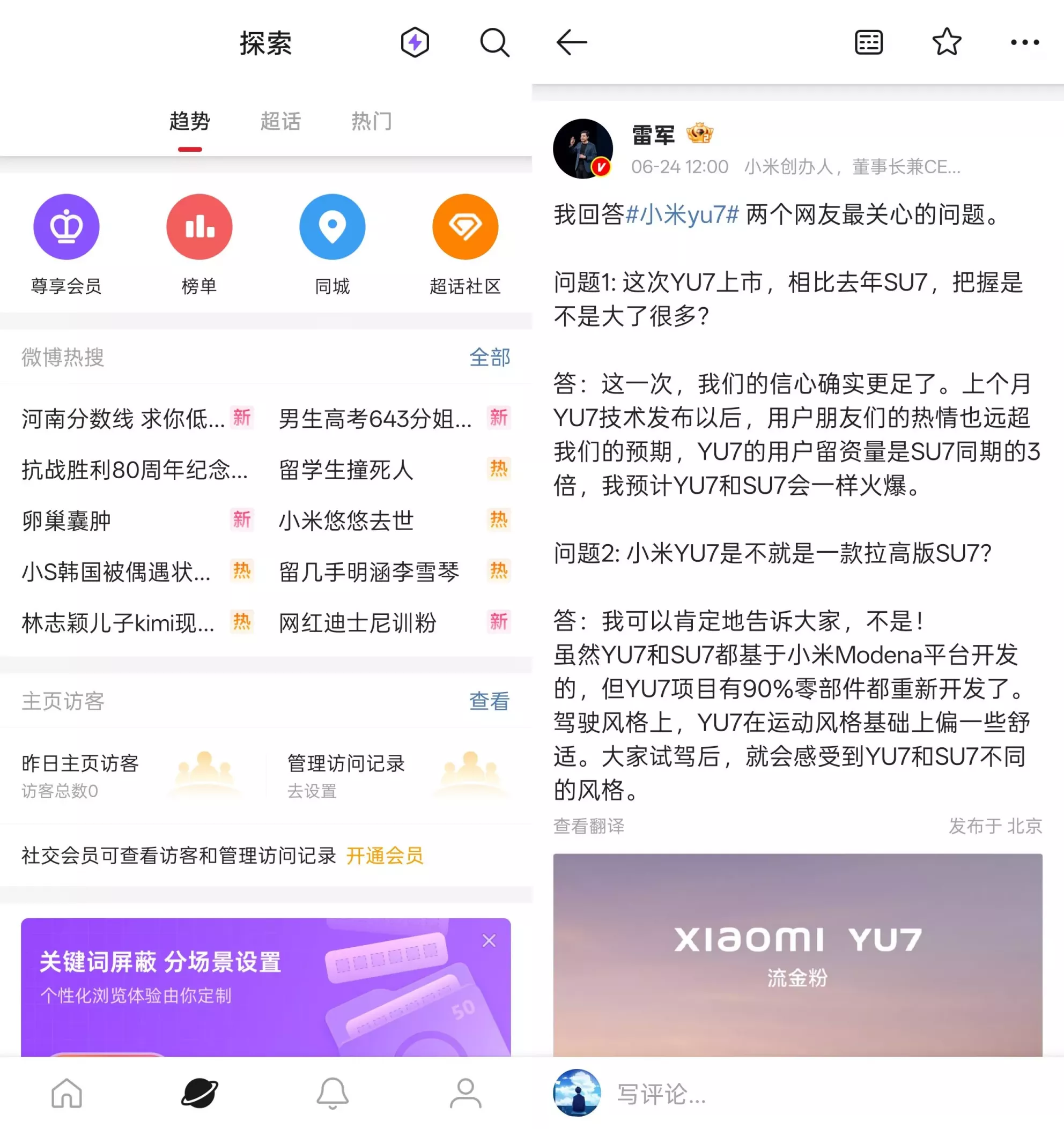 内容创作:发布图文/短视频、多图上传、定位分享社交互动:评论(支持图评)、点赞、收藏、私信、分组管理资讯获取:热搜榜、热门视频、话题追踪、关键词屏蔽(会员专享)
