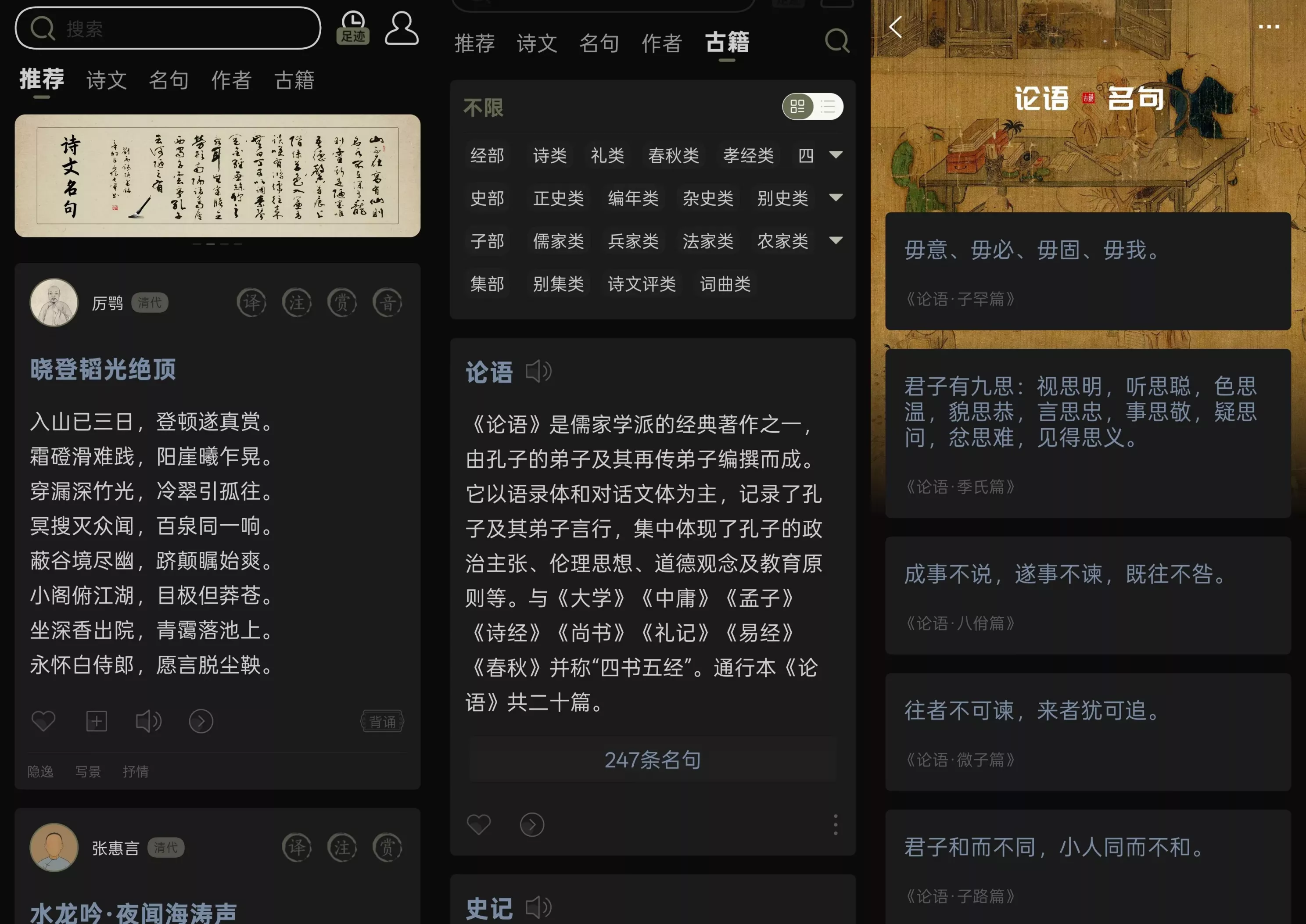 每日名句推送:精选经典诗句每日更新,用户可一键收藏或分享至社交平台。用户创作社区:允许用户发表诗词解析文章或原创作品,促进文化交流与互动。特色亮点朝代分类与文化脉络梳理 按历史时期分类诗人及作品,用户可系统性了解各朝代文学风格演变,如“唐诗的豪放”与“宋词的婉约”对比。早教启蒙与专业研究兼顾 针对儿童设计拼音版本,同时为学术研究者提供诗人生平事迹、作品合集等深度资料。离线模式与多端同步 支持离线下载诗词内容,登录账号后可跨设备同步学习进度与收藏内容。适用场景与用户群体学生群体:通过注释、朗诵功能辅助课内学习,备考语文考试。传统文化爱好者:探索诗人生平、作品合集,满足深度研究需求。亲子共学:拼音标注与动画视频助力家长开展家庭国学教育。用户评价与行业定位