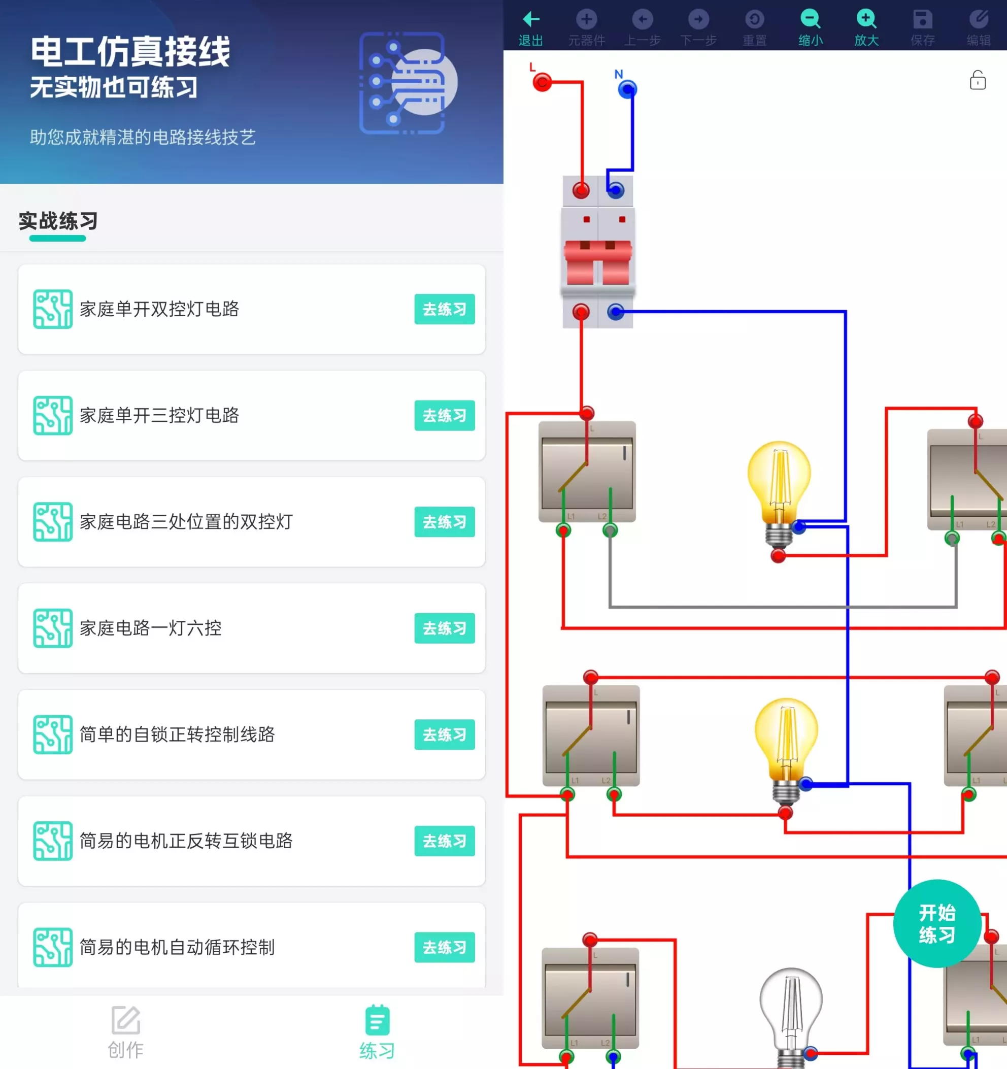 核心功能亮点1. 多场景电路仿真家庭电路:支持照明线路、插座回路等常见家装电路模拟,涵盖单控/双控开关、漏电保护器等元件接线。工业电路:模拟电机控制、继电器系统、配电网络等复杂场景,包含交流接触器、热继电器、时间继电器等工业元件。考证题库集成:内置低压/高压电工资格考试真题电路,如自锁控制、正反转电路等,辅助用户针对性备考。2. 智能实训与实时反馈动态参数监测:接线过程中实时显示电流、电压、功率等参数变化,直观验证电路设计的合理性。故障模拟与警报:自动检测短路、过载、断路等故障,并推送预警提示,培养用户排障能力。操作回放与修正:支持步骤回溯和重置功能,便于用户复盘错误操作,优化接线逻辑。四、同类软件对比优势