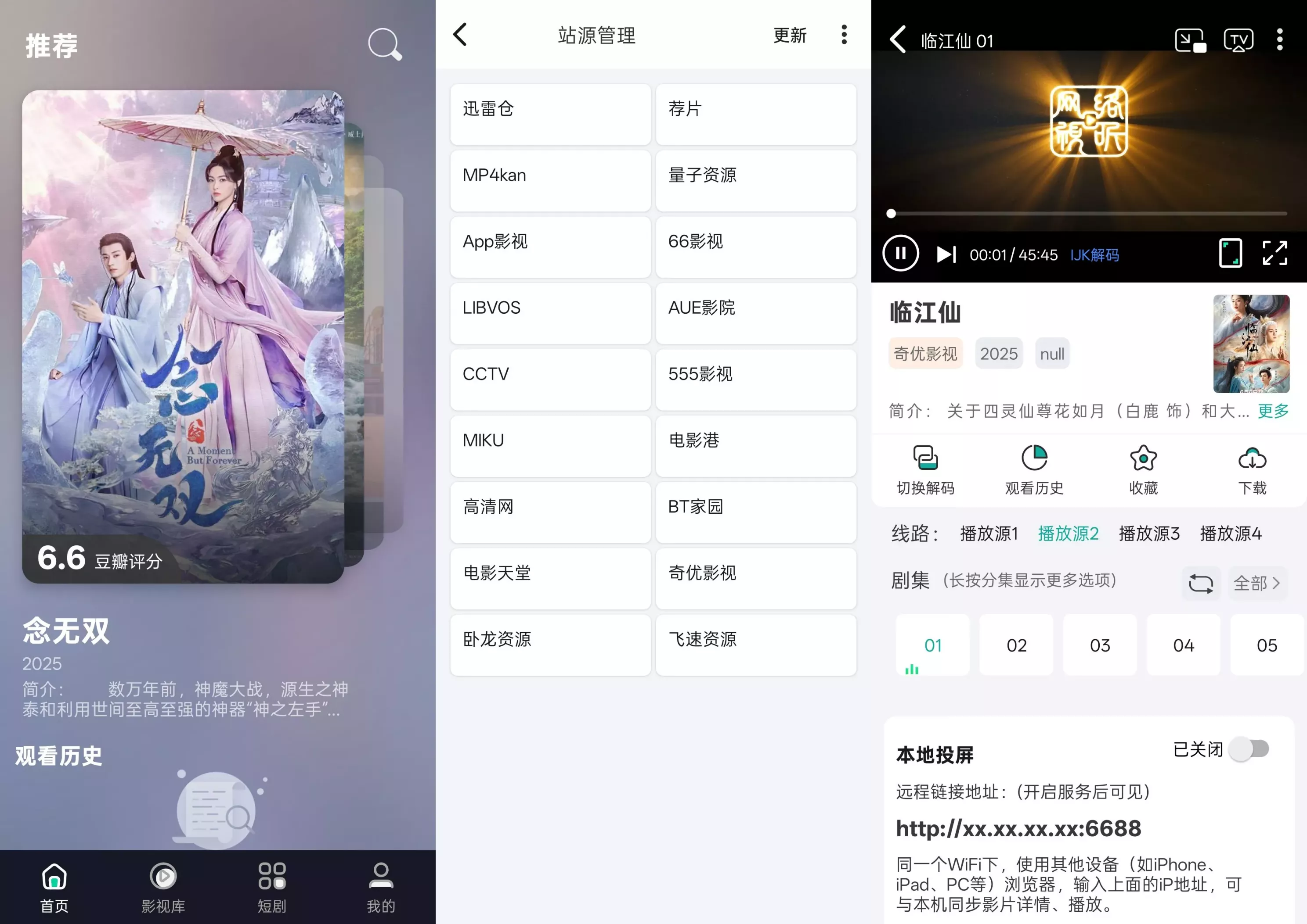 极光影院App还内置了投屏助手,支持将手机上的影片投射到电视等大屏设备上,享受更震撼的观影效果。同时,用户还可以在同一个WiFi下,通过其他设备(如iPhone、iPad、PC等)浏览器输入远程链接地址,与本机同步影片详情、播放,实现多屏互动。