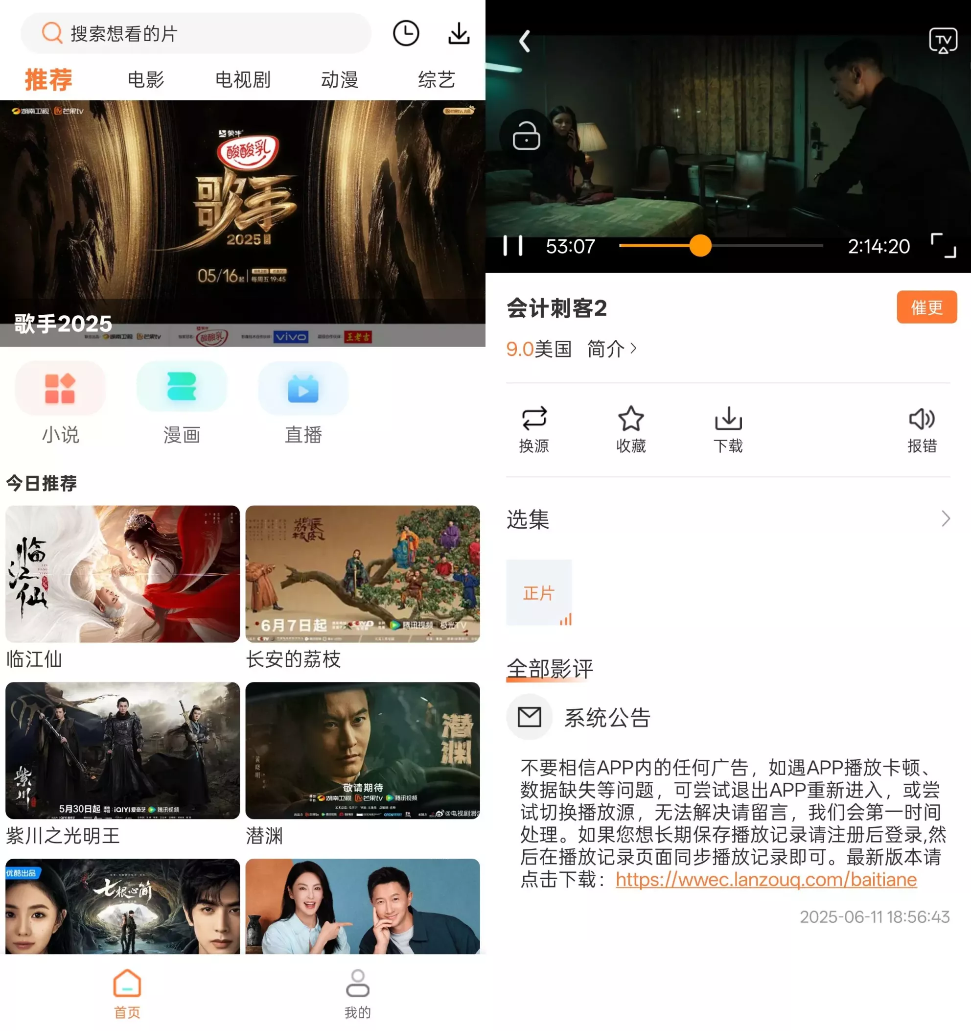 【四维内容矩阵,满足全场景娱乐需求】动漫宇宙触手可及:汇聚《妖神记》《凤逆天下》等国漫精品,采用高清流畅的播放引擎,搭配智能进度记忆功能,让二次元爱好者随时穿越异世界。小说阅读新体验:收录《神农道君》《绝色骄天下长宁知白》等海量作品,支持自定义字体、夜间模式与仿真翻页,打造纸质书般的沉浸感。影视资源实时更新:从《会计刺客2》等院线大片到《临江仙》《紫川之光明王》等热门剧集,提供4K蓝光画质与多源切换功能,更有“追更提醒”确保永不错过更新。电视直播零延迟:涵盖CCTV-1综合、CCTV-6电影等30+央卫视频道,通过智能解码技术实现直播流零缓冲,重大赛事、热播综艺实时同步。【极简美学与深度定制的平衡】