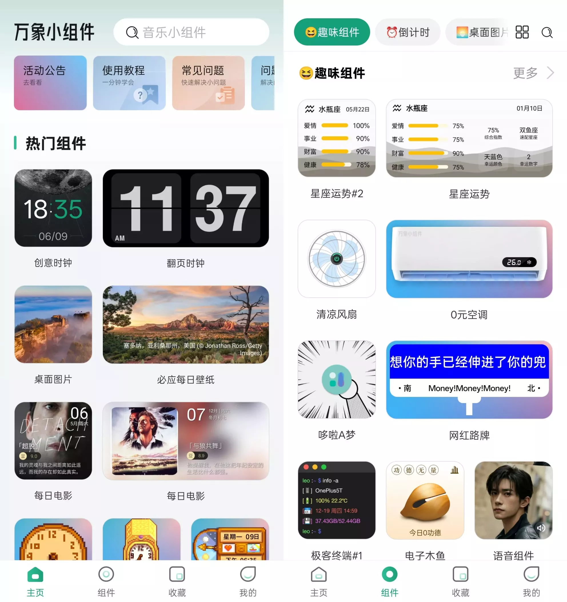 核心功能亮点1. 个性化桌面定制自定义设计:支持背景、字体颜色、高斯模糊等多样化设置,用户可自由调整小组件的外观,打造独一无二的桌面风格。动态壁纸与图片展示:每日精选精美壁纸推送,或从相册中选择照片作为桌面背景,让手机界面焕然一新。2. 高效实用工具快捷支付:一键直达微信、支付宝等应用的扫码和付款功能,无需频繁切换界面。智能文件夹管理:将海量应用图标分类收纳,告别杂乱桌面,提升操作效率。倒计时与正计时:记录生日、纪念日、项目截止日等重要节点,或用于专注学习、运动计时。3. 实时信息整合精准天气预报:提供未来7天天气详情,支持自定义显示样式,助你合理规划出行。资讯热点追踪:聚合微博、百度、抖音热搜话题,随时掌握社会动态与娱乐八卦。日历与节气提醒:集成公历、农历、节假日及传统节气信息,重要日期一目了然。4. 趣味社交与生活辅助星座运势与情侣互动:提供每日星座运势预测,支持情侣留言板、爱心比拼等功能,增添情感互动乐趣。功德木鱼与习惯打卡:通过敲击木鱼积累“功德”,或制定目标计划,培养良好习惯。音乐播放器与待办清单:直接在桌面控制音乐播放,或添加待办事项,轻松管理每日任务。适合人群效率控:通过快捷支付、文件夹管理和日程提醒功能,提升工作与生活效率。颜值党:利用高自由度的自定义选项,打造专属美学桌面。社交达人:借助星座互动、热搜追踪等功能,时刻保持社交热度。
