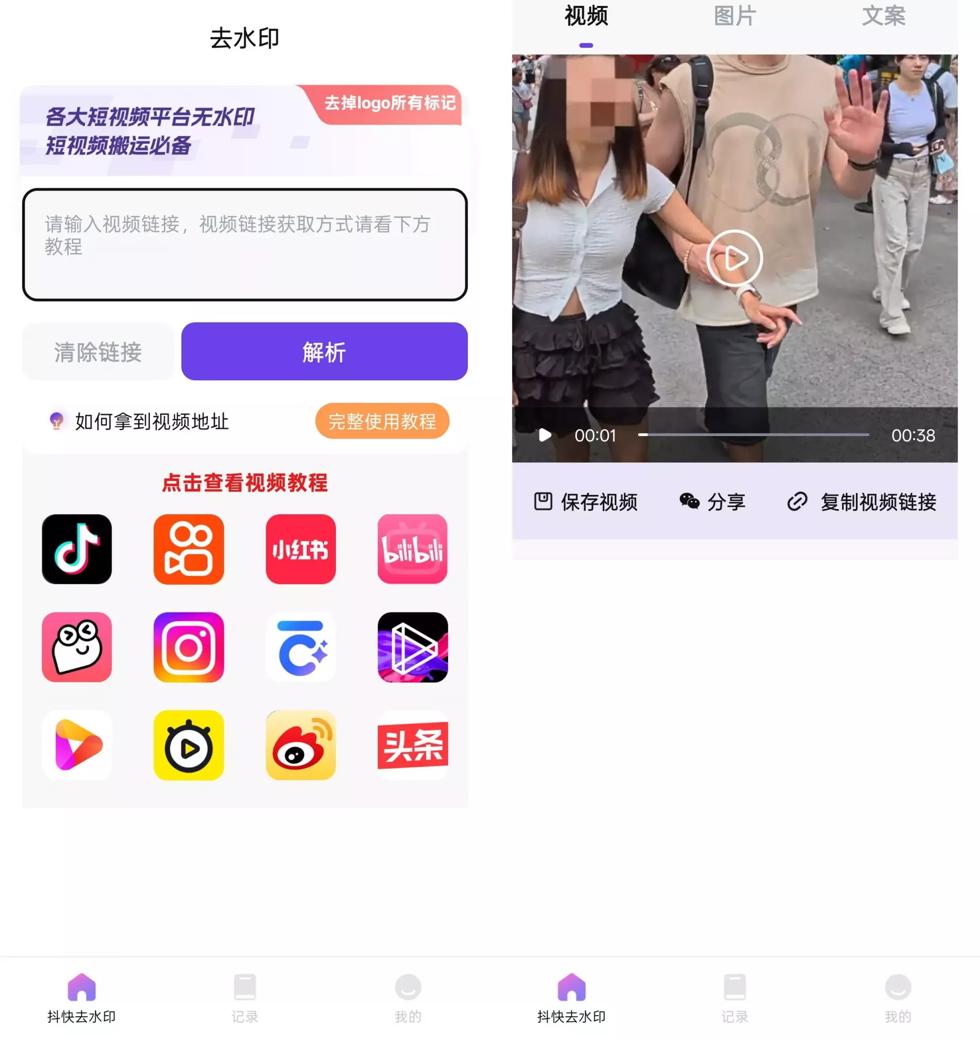全能去水印App的操作界面简洁明了,用户只需输入视频链接,即可快速解析并去除视频水印。同时,App还提供了详细的视频链接获取教程,确保用户能够轻松上手。去除水印后的视频支持保存、分享和复制链接,方便用户进行后续处理。