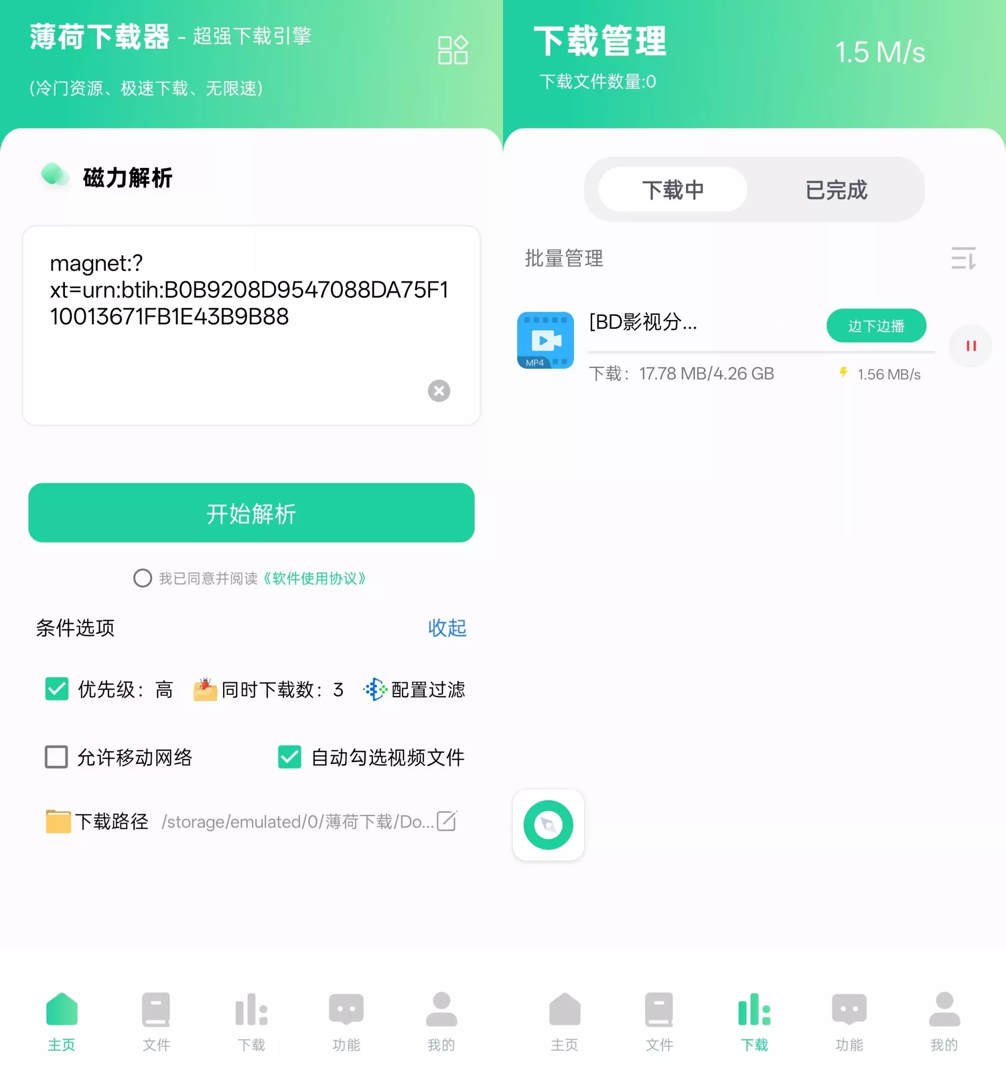薄荷下载app是一款专业级下载管理软件,专为安卓设备设计。该应用不仅支持多种文件格式的下载,如HTTP、FTP、BT种子以及磁力链接,还提供了一系列增强用户体验的功能。用户可以通过这款软件轻松搜索、解析并下载网络上的各种资源。