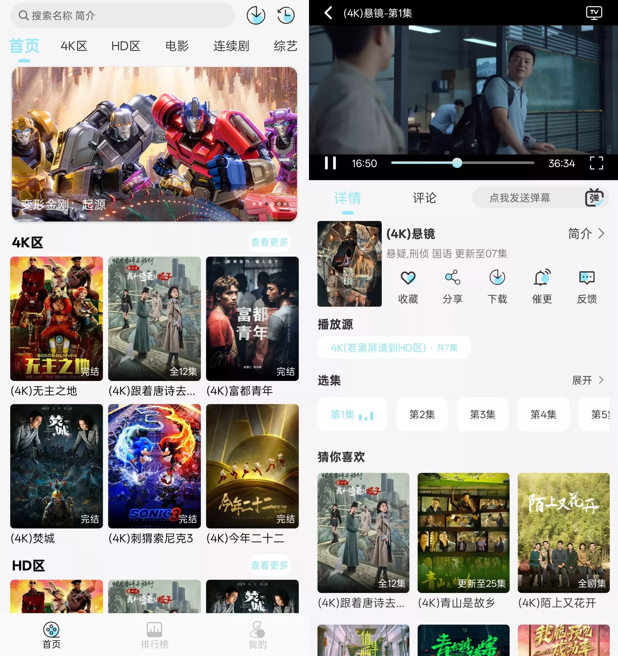 晴天4K主打“4K修复专区”,提供经过专业优化的影视资源,支持高清、超清、蓝光及4K多级分辨率切换。用户可一键进入4K专区,享受每一帧画面的细腻呈现,即使网络波动也能通过切换播放源保持流畅。