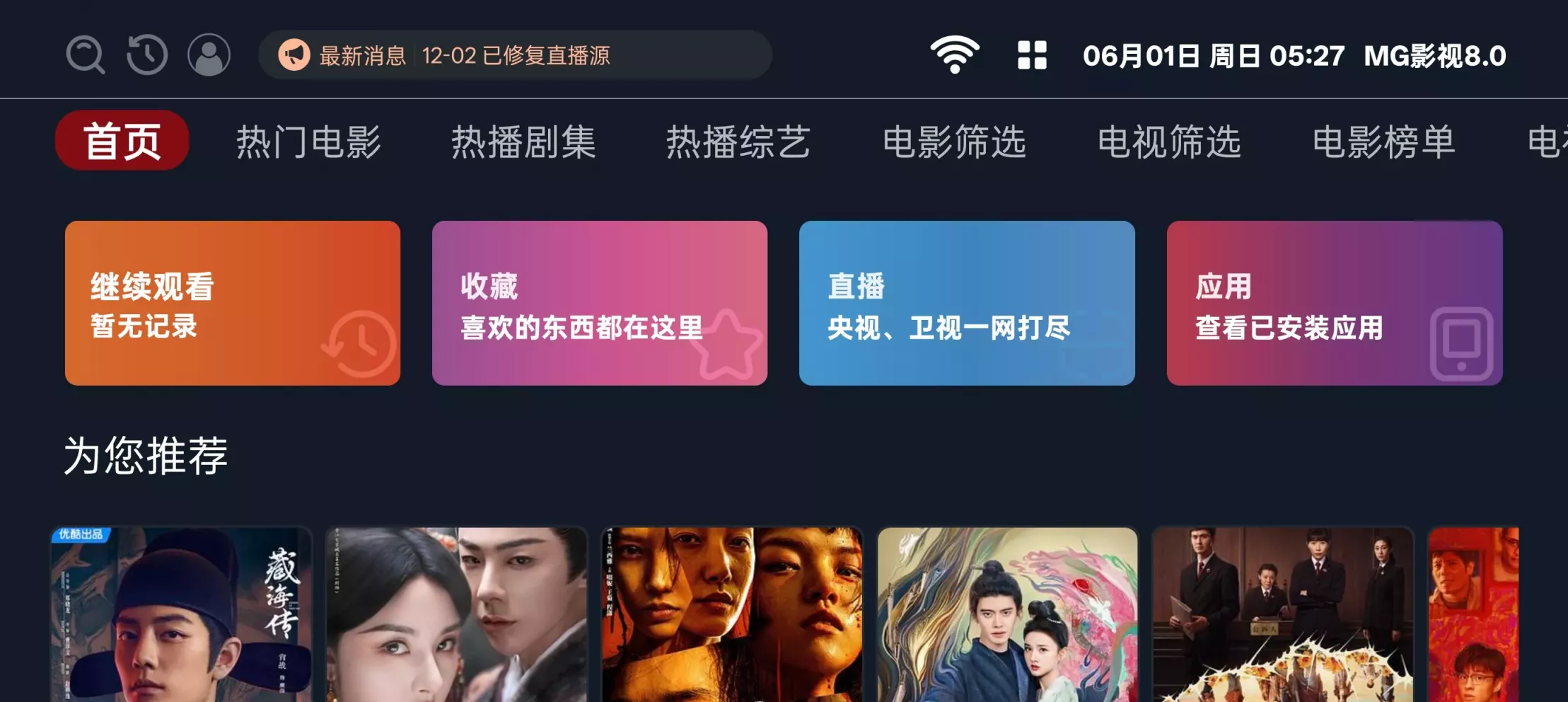 MG影视凭借其强大的资源聚合能力、丰富的免费影视库、专业的电视直播体验、实用的榜单推荐以及为大屏深度优化的操作界面,成为智能电视和电视盒子用户获取免费、便捷、丰富视听娱乐内容的理想选择。无论是追剧、看电影、看综艺还是看直播,MG影视都能成为您客厅娱乐的得力助手!