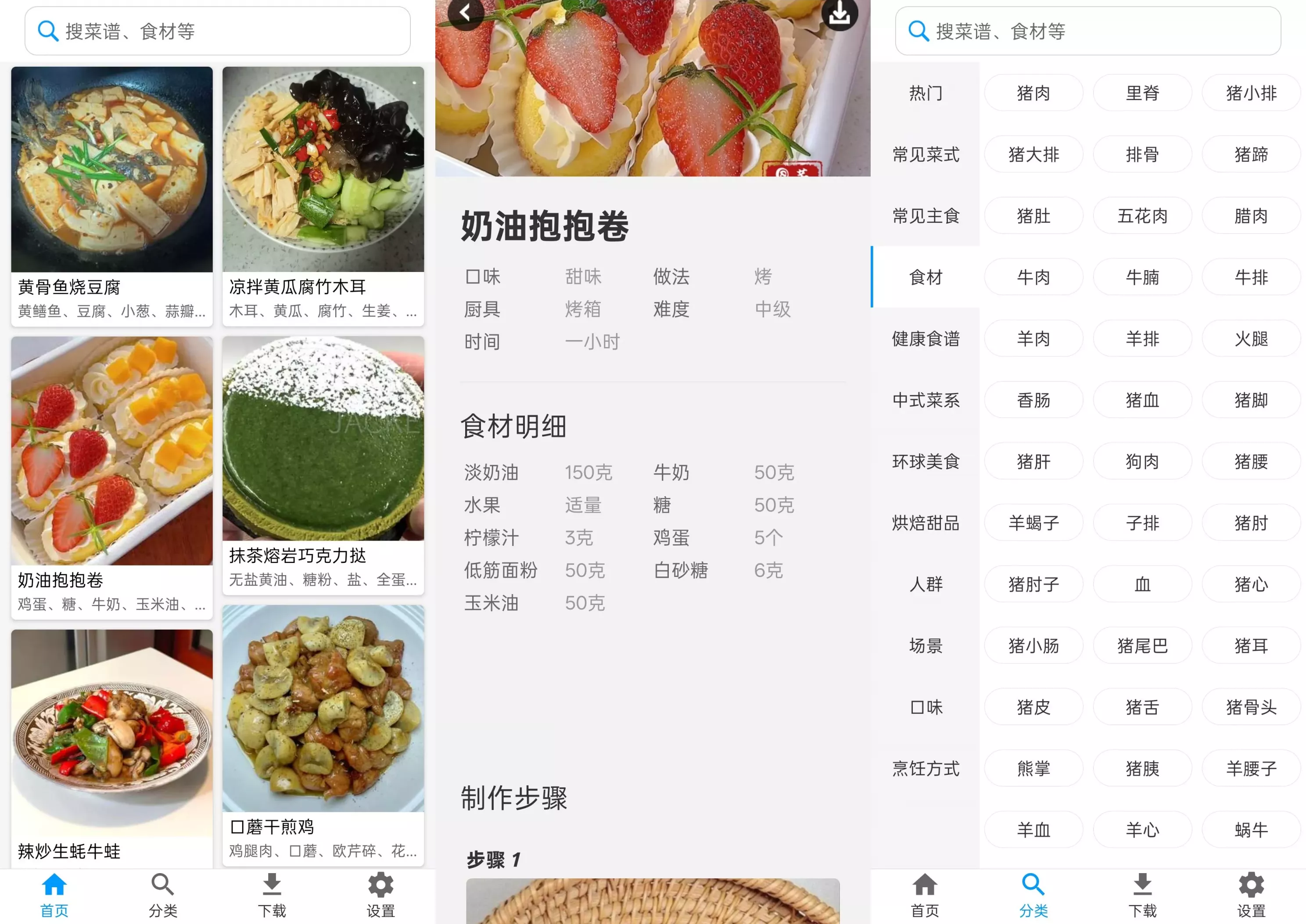 功能亮点:智能搜索,一键直达:无论您是想做一道家常小炒,还是尝试异国风味,美食菜谱App的智能搜索功能都能快速响应。只需输入菜名、食材或口味等关键词,如“奶油抱抱卷”“低脂午餐”等,App便能瞬间呈现相关菜谱,让您轻松找到心仪之选。分类浏览,随心所欲:App提供了丰富多样的菜谱分类,包括热门推荐、常见菜式、主食点心、食材专区、中式菜系、环球美食、烘焙甜品等,满足您不同的烹饪需求。无论是想快速解决一顿晚餐,还是想挑战高难度烘焙,都能在这里找到合适的菜谱。