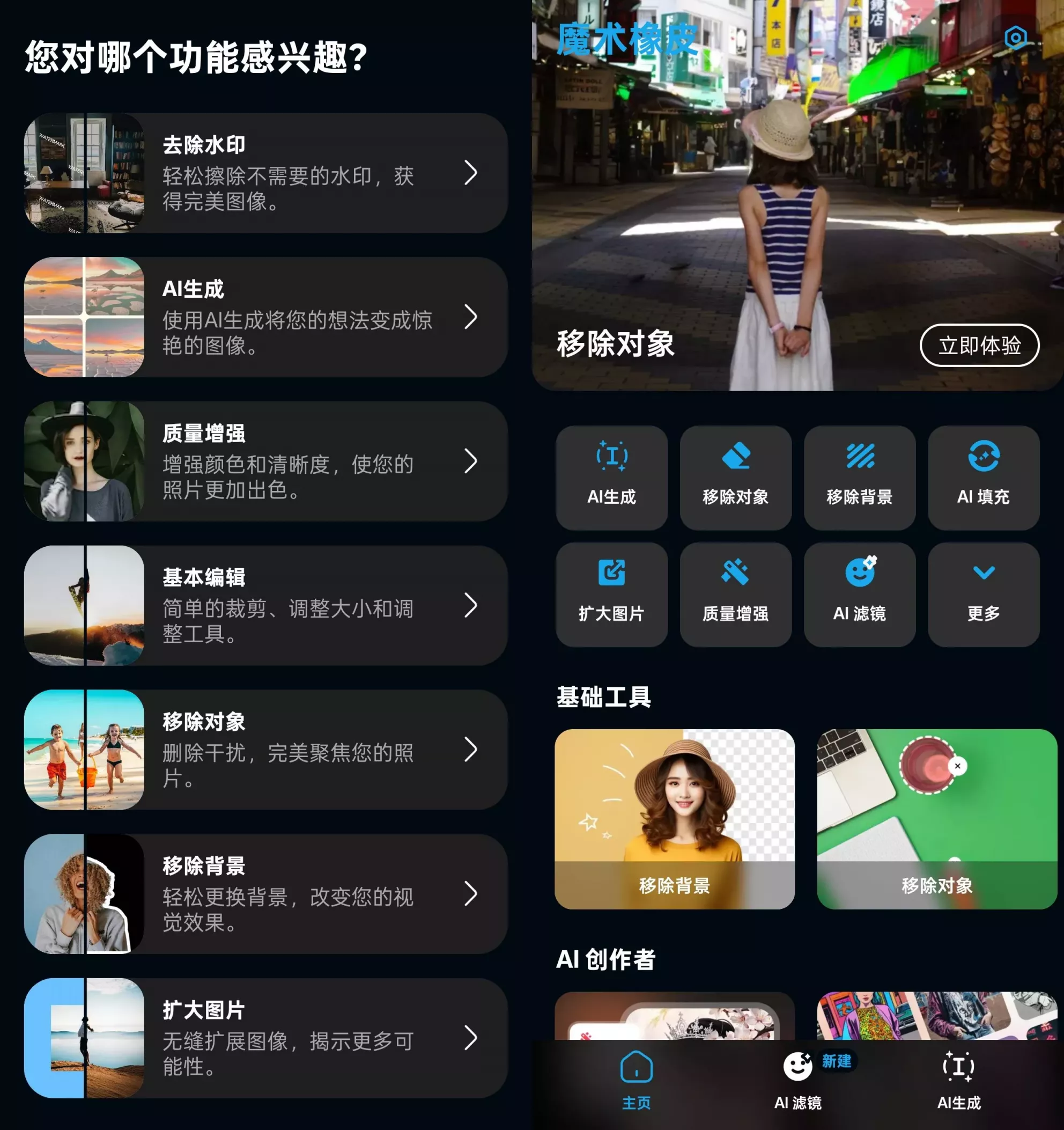 魔术橡皮App是一款基于AI技术的智能图像处理工具,专注于高效去除照片中的多余元素,同时提供丰富的编辑功能,让用户轻松实现专业级修图效果。该软件凭借其精准的智能识别算法和简洁的操作界面,成为摄影爱好者、设计师及普通用户的修图利器。