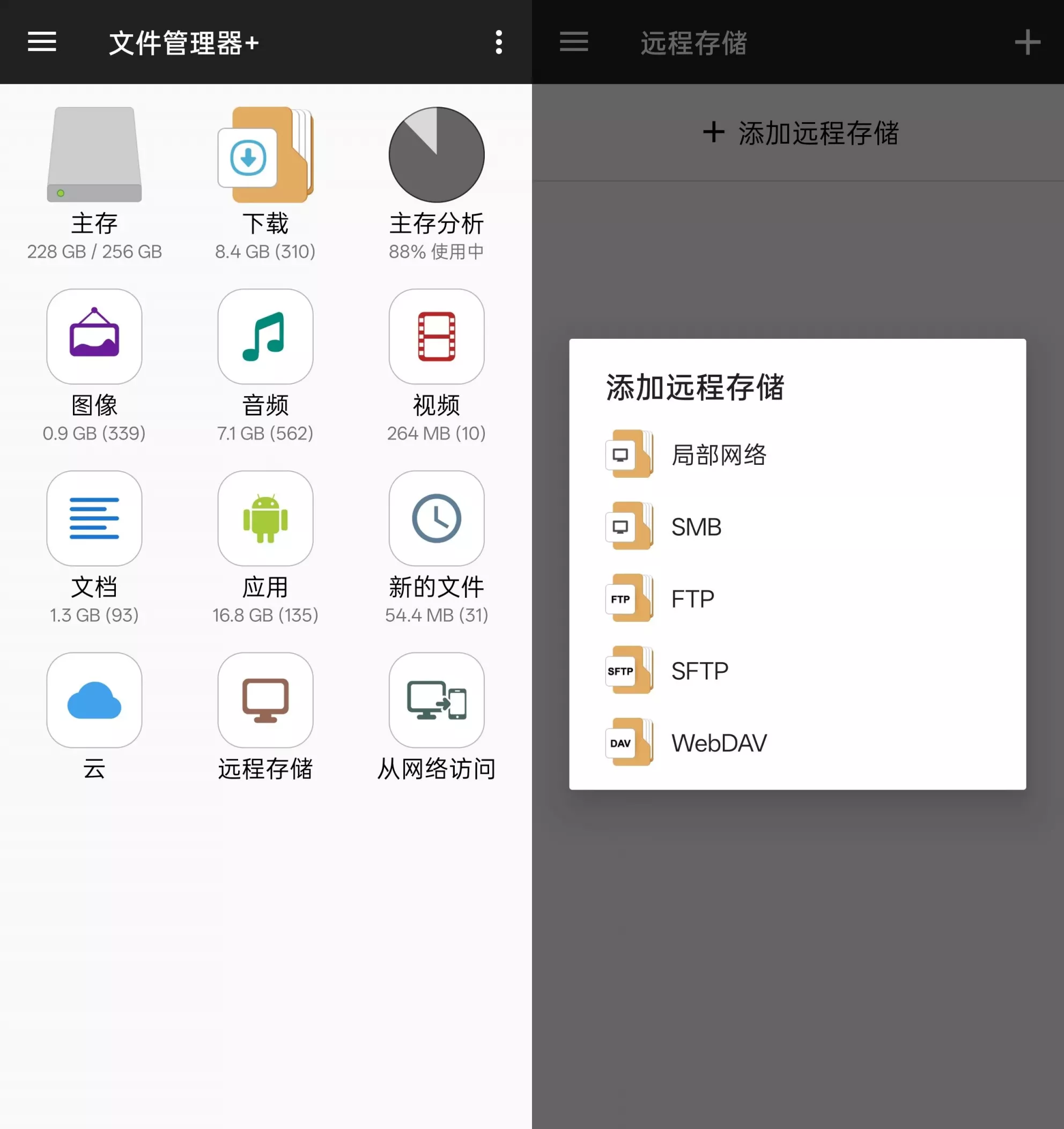 核心功能解析1. 全场景文件管理本地与扩展存储:可管理内部存储、SD卡及通过OTG连接的U盘文件,支持复制、剪切、重命名、压缩解压等操作,并提供按类型(如图片、视频、文档等)自动分类的智能视图。云端与远程服务:无缝集成Google Drive、Dropbox、OneDrive等主流云存储,同时支持FTP、SFTP、WebDAV等协议访问NAS或远程服务器,实现跨平台文件同步与编辑。2. 高效存储优化工具存储分析:通过可视化图表展示空间占用情况,快速定位大文件或冗余缓存,并提供一键清理建议,帮助用户释放存储空间。应用程序管理:支持批量卸载应用、备份APK文件,甚至可查看已安装应用的详细数据占用,便于系统优化。3. 特色工具与增强体验内置实用程序:集成图片查看器、音乐播放器及文本编辑器,无需依赖第三方应用即可预览或编辑文件,提升操作效率。Wi-Fi文件传输:通过创建热点或FTP服务器,实现手机与电脑间的无线文件传输,摆脱数据线束缚。4. 安全与个性化文件加密与隐藏:支持对敏感文件或文件夹设置密码保护,并可隐藏私密内容,防止未经授权访问。界面定制:提供多主题切换及布局调整功能,用户可根据喜好自定义颜色方案与分类排序方式。典型使用场景示例办公场景:通过WebDAV连接公司服务器,直接编辑云端文档并同步至手机本地。媒体管理:利用分类视图快速整理相册,并通过内置播放器预览视频片段。跨设备协作:开启FTP服务后,从电脑浏览器直接拖拽文件至手机存储,实现高效传输。