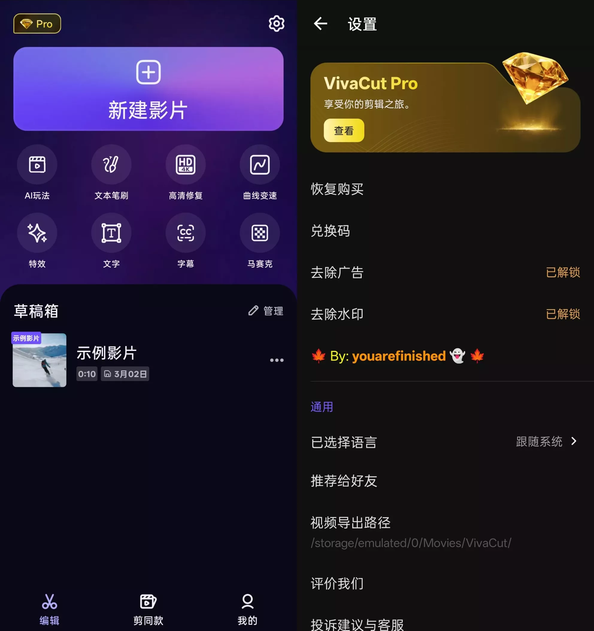 好莱坞级视频剪辑功能绿幕抠图与视频合成 支持好莱坞电影级别的绿幕抠图和视频合成,轻松打造动作大片效果。关键帧动画 可应用于蒙版、视频/照片画中画、文字、贴纸和emoji,让视频更具创意。蒙版工具 提供线性、镜像、径向、矩形、椭圆等多种形状,满足不同场景需求。音乐卡点与音频提取 支持根据音乐节奏为视频打点,还能提取视频中的音频,解决配乐难题。专业视频剪辑工具多层时间轴 界面直观流畅,支持逐帧精确缩放和修剪,让编辑更加精准。文字与字幕 支持emoji,可自由调整字体、阴影、颜色和透明度。转场与特效 提供多种电影级转场效果,让视频过渡更加自然。视频参数调节 可调整亮度、对比度、饱和度、色调、色温、暗角等,满足个性化需求。滤镜与音乐 内置可调节滤镜和丰富的背景音乐库,轻松打造专属风格。视频剪辑与合成剪切与拼接 提供专业的剪切工具,支持分割、裁剪和拼接,让视频编辑更加灵活。画中画与双重曝光 支持多图层拼贴和多种混合模式,如颜色加深、相乘、柔光等,打造独特视觉效果。变速与相片MV 支持0.2x至4x的变速调节,还可将图片与音乐结合,创作个性相片MV。一键分享 支持一键分享至微信、抖音、微博等平台,轻松分享创作成果。修改内容:去除广告去除水印破解VivaCut Pro特权: