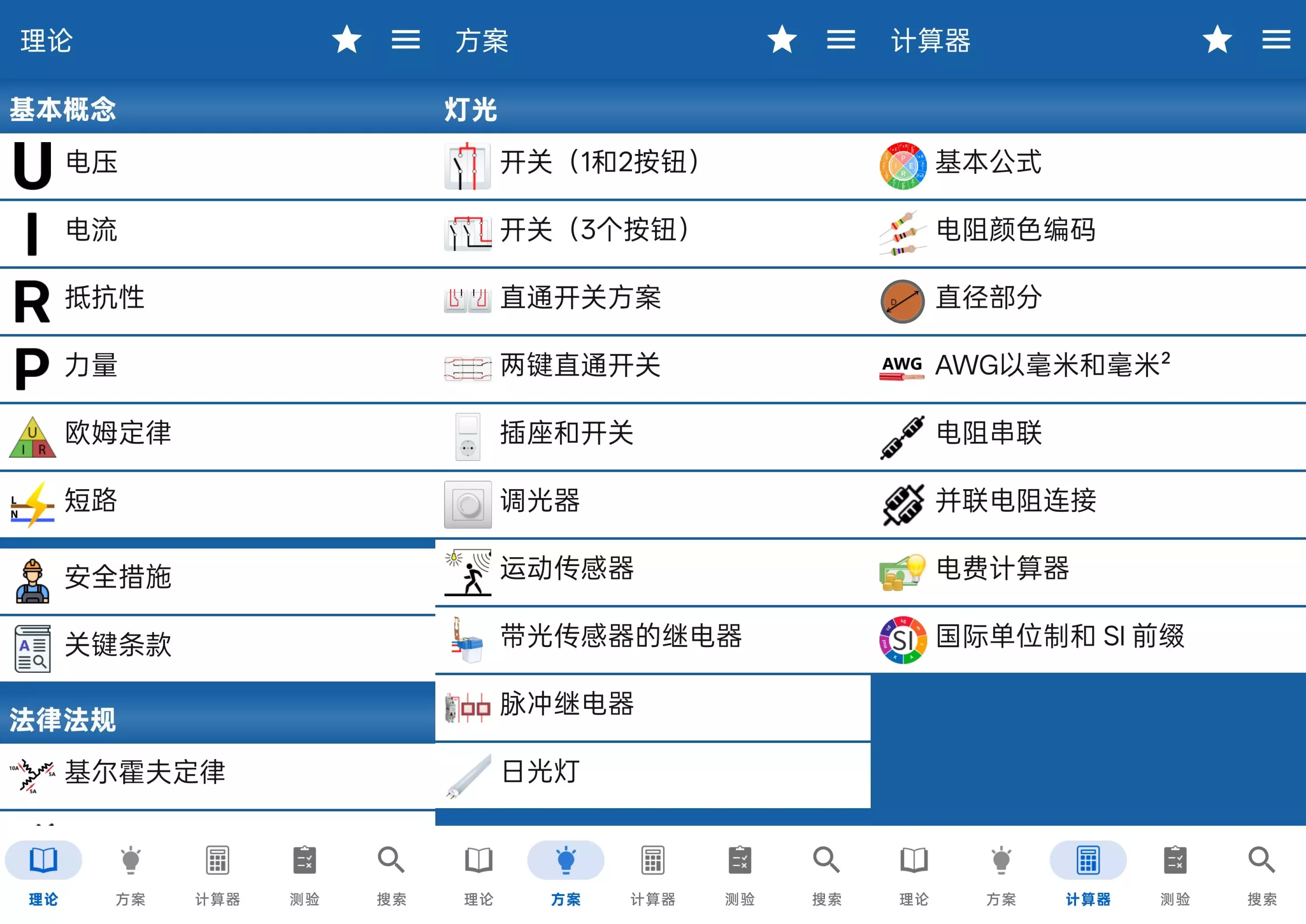 丰富知识宝库:软件涵盖全面的电气知识,从基础的欧姆定律、基尔霍夫定律等电学定律,到发电站、变电站等电力设备知识,再到电气安全相关内容,应有尽有。还包含电气测量仪器介绍、电子电路符号等知识,满足不同层次用户的学习与工作需求。实用计算工具:具备多种实用计算功能,如电阻颜色编码识别、电阻串联和并联计算、电费计算等。操作简单,输入参数即可快速得出准确结果,有效提升工作效率。多样学习辅助:“理论”板块深入讲解电气原理;“方案”展示各类电气方案示例;“测验”用于测试知识掌握程度;“搜索”功能方便快速查找所需内容,辅助用户学习与实践。广泛应用场景:适用于电气设计人员、电工日常作业,以及学生学习电气知识。能辅助设计电路、查询设备信息、确定故障处理方法,帮助学生巩固知识。