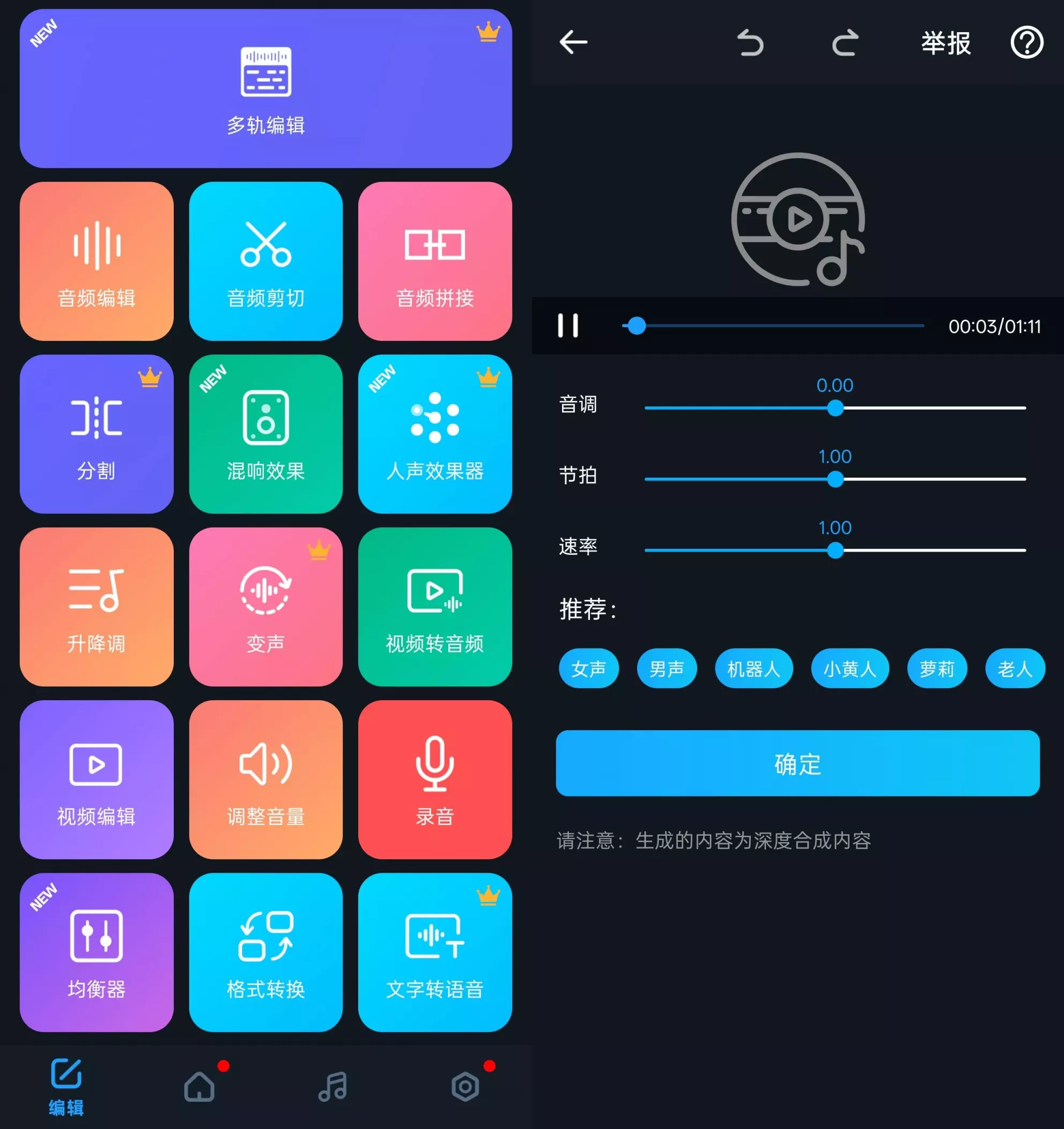 核心功能1. 多维度音频编辑基础处理:支持音频剪辑、拼接、分割、淡入淡出、变速变调等操作,用户可精准裁剪音乐片段或合并多段音频。高级功能:包括多轨混音(支持音轨比例调整与对齐)、消除人声(保留伴奏)、声道转换(单声道转立体声),以及音频倒放等创意效果。音效增强:内置均衡器、混响、压缩器等16种以上音效插件,支持音量动态调整与音质优化。2. 格式兼容与转换支持 MP3、WAV、AAC、FLAC 等主流格式的导入与导出,并提供批量格式转换功能,适配不同平台需求。视频处理能力:可从视频中提取音频,或为视频添加背景音乐、调整音画同步,满足短视频创作者需求。3. 创意工具与素材库变声与特效:提供变声参数调节(如音调、速率),支持实时录音并混入编辑轨道,创作个性化作品。丰富资源:内置2000+音乐素材与音效库,涵盖乐器、鼓点、环境音等,用户可直接调用或组合创新。4. 效率优化设计批量操作:支持批量压缩音频、调整音量、转换格式,大幅提升处理效率。云端同步:编辑项目可保存至云端,跨设备无缝协作,并支持一键分享至社交平台。软件优势解析1. 零门槛与专业性并存界面直观简洁,新手可通过拖拽操作快速上手;同时提供多轨编辑、波形可视化等专业功能,满足音乐制作人需求。免费无广告:破解专业版功能,无需付费即可享受完整服务。2. 用户场景全覆盖日常娱乐:制作手机铃声、提取视频背景音乐。专业创作:多轨混音、音效合成、母带处理。教育用途:通过升降调功能辅助声乐练习,或利用文本转语音生成教学素材。适用人群推荐音乐爱好者:无需专业背景,快速制作个性化铃声或混音作品。短视频创作者:高效处理视频音频,添加特效提升内容质量。专业音乐人:多轨编辑与高级音效满足复杂创作需求。