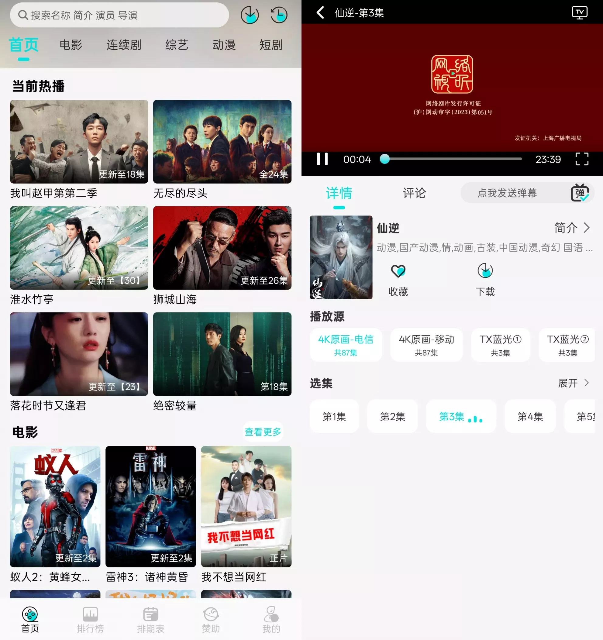 提供4K原画、TX蓝光等十多天线路选择,适配电信、移动等不同网络源,确保观影流畅不卡顿。支持选集切换、倍速播放、弹幕互动,让观剧体验更自由。