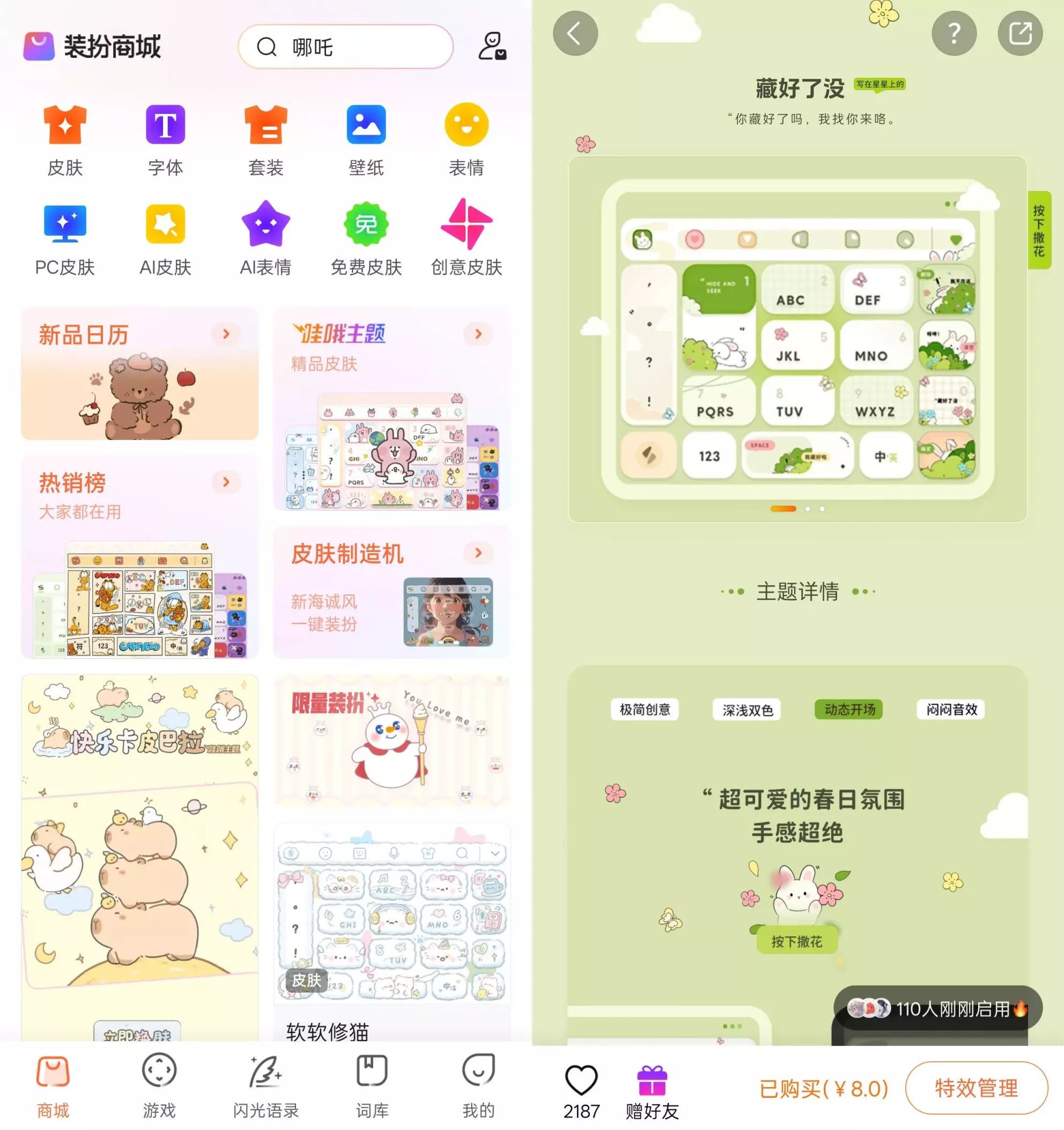 主题商城:与Line Friends、漫威等200+IP联名,每日更新动态皮肤 字酷实验室:DIY渐变色字体,首创动态歌词皮肤(随音乐律动变化) 花漾字功能:在聊天中插入发光/抖动/弹幕特效文字,斗图稳赢