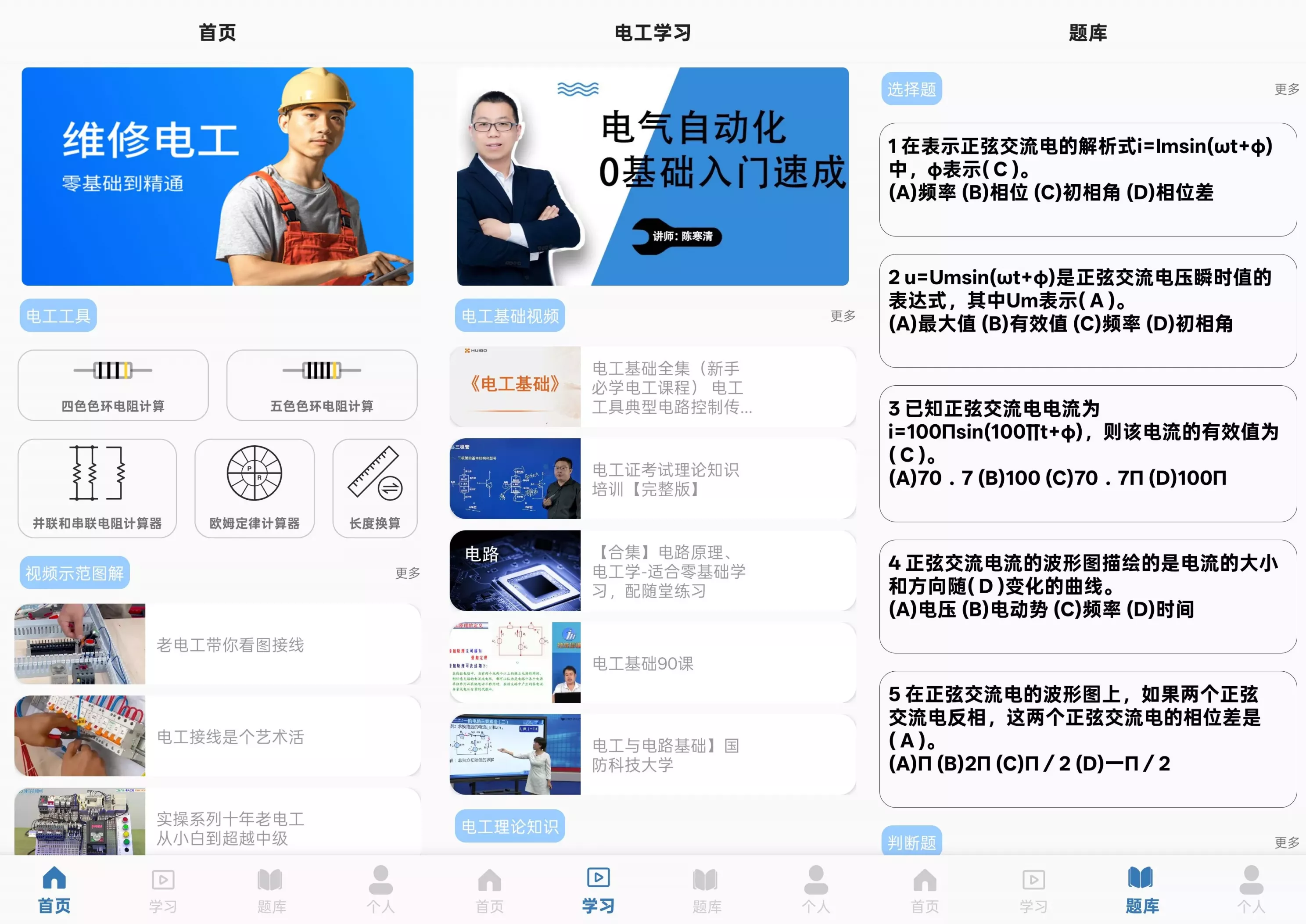 电工APP的突出优势在于其"三位一体"服务理念:通过权威题库夯实应试基础,借助生动视频提升理解深度,依托实用工具培养实操能力。