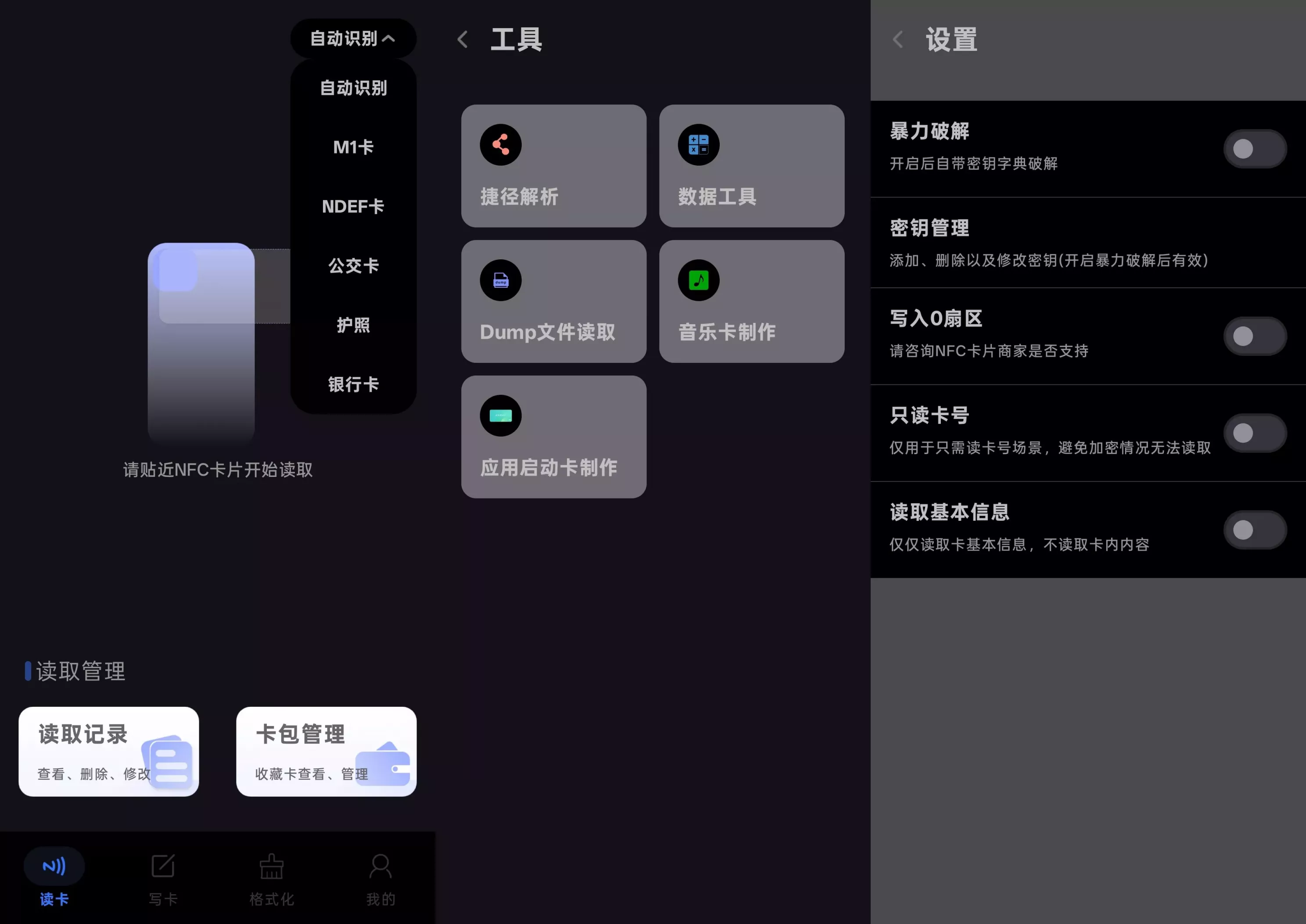 软件提供格式化功能,可清除卡片原有数据。对于加密卡片,用户可通过添加已知密钥或使用自带字典暴力破解部分加密类型,提升卡片兼容性。