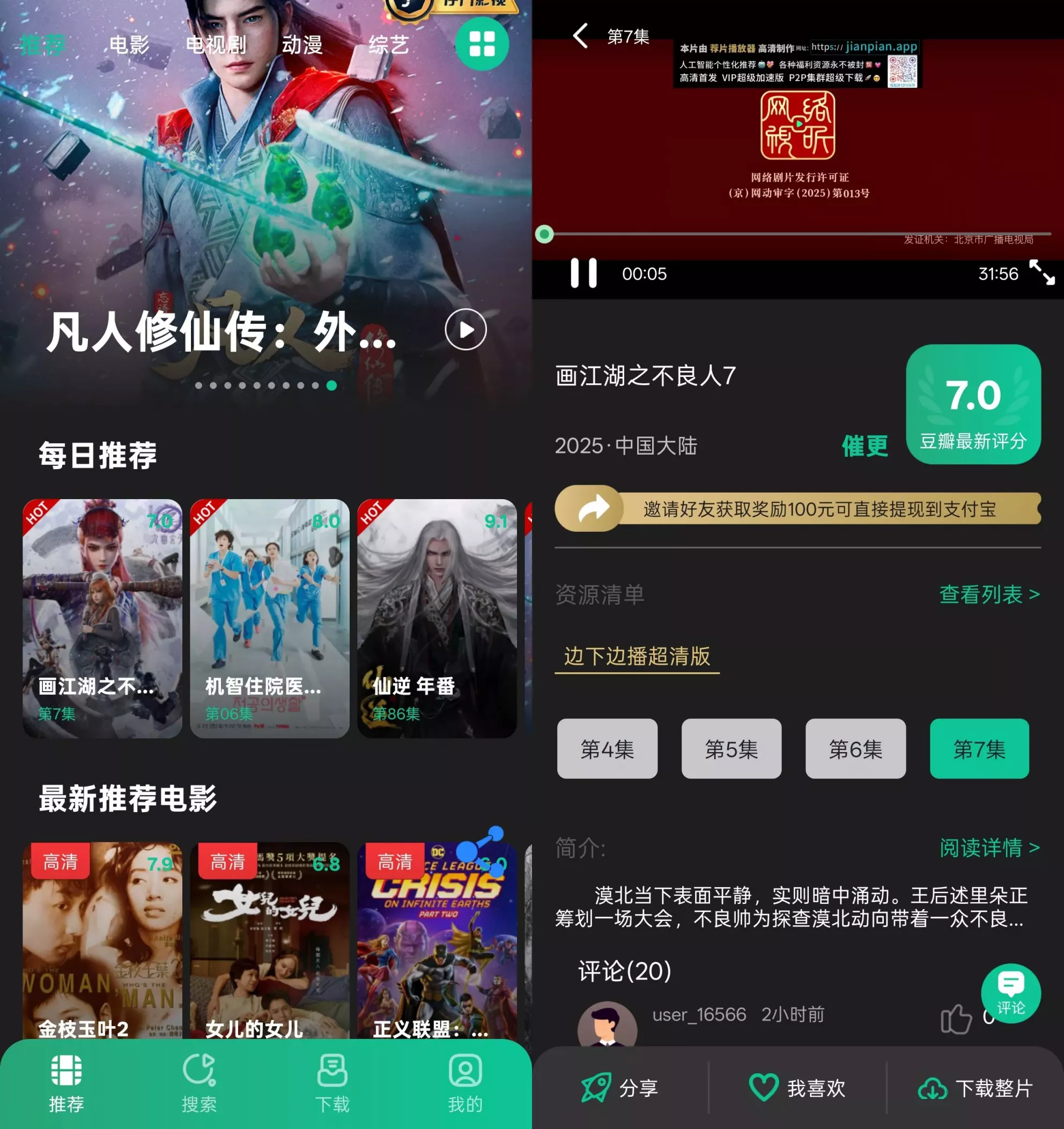 核心功能海量资源聚合,全网更新同步 荐片汇聚国内外优质影视资源,涵盖电影、电视剧、动漫、综艺、纪录片等全品类,实时同步更新院线热映大片、平台热播剧及小众高分佳作,告别剧荒烦恼。AI智能推荐,精准匹配喜好 基于用户观影历史与偏好,结合先进算法,荐片精准推送符合口味的影视作品。从悬疑推理到浪漫爱情,从科幻大片到治愈系综艺,你的每一秒选择都被用心记录。高清流畅播放,多画质自由切换 支持超清画质,适配高速网络与低流量模式。采用P2P云播技术,播放流畅不卡顿,即使网络不稳定也能轻松享受影院级视觉体验。离线下载,随时随地追剧 支持视频缓存至本地,出差旅行无网络也能随时观看;内置下载管理器,批量下载多集剧集,追剧进度永不掉线。结语