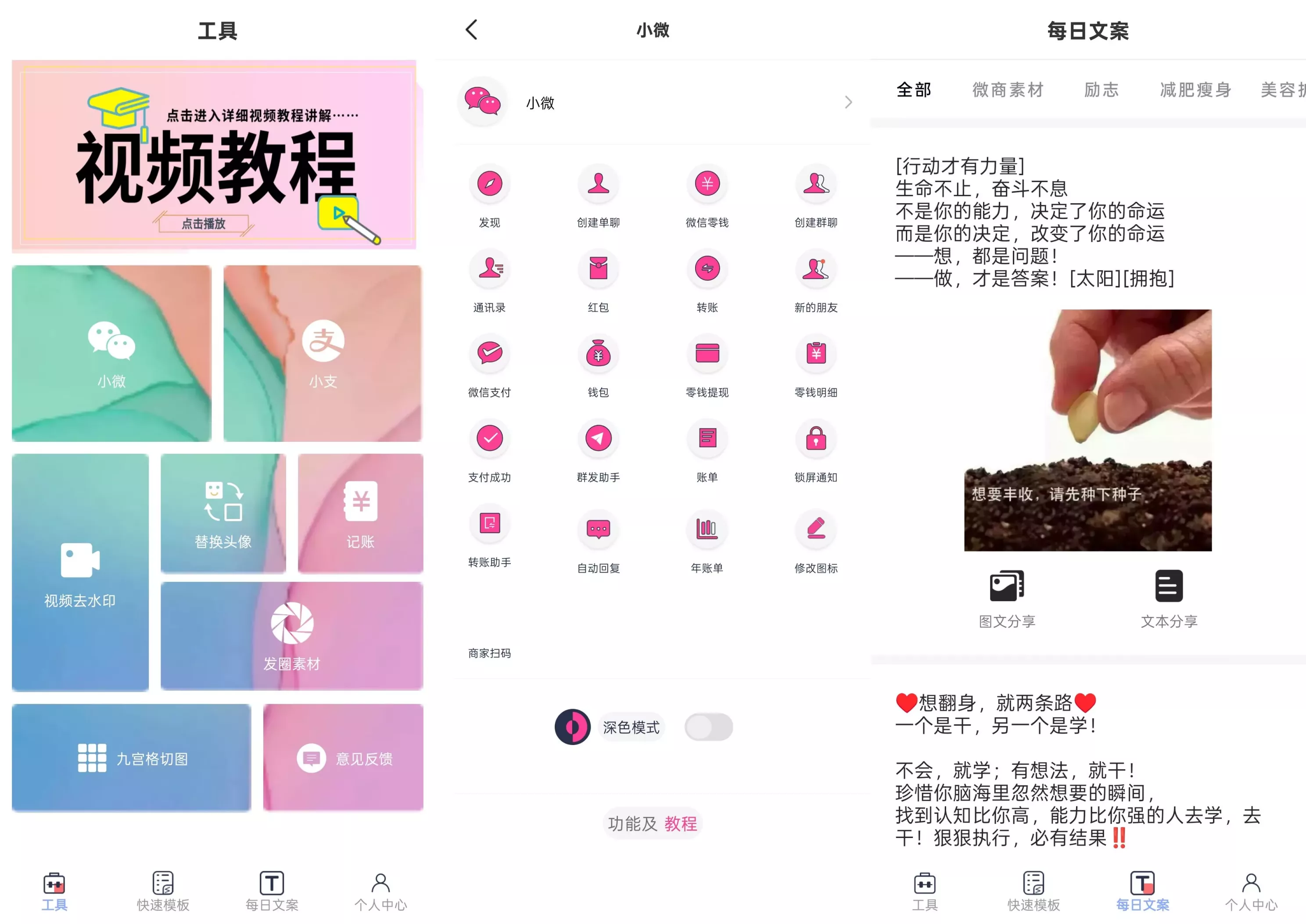 软件功能截图功能:可以生成各种高清截图,如聊天截图、转账截图、朋友圈点赞评论截图、零钱提现截图、消息推送图等,超过100个功能页面,满足微商在各种营销场景下的需求。素材库:提供丰富的素材资源,包括图片、文字、贴纸等,用户可以根据需要自由选择并编辑,让每一张图片都更具吸引力。九宫格图片制作:提供一键生成热门九宫格图片模板的功能,方便用户在朋友圈中展示产品。长图拼接:支持将多张图片拼接成长图,方便制作长篇内容。视频去水印:支持多平台视频无水印解析保存,方便二次创作。