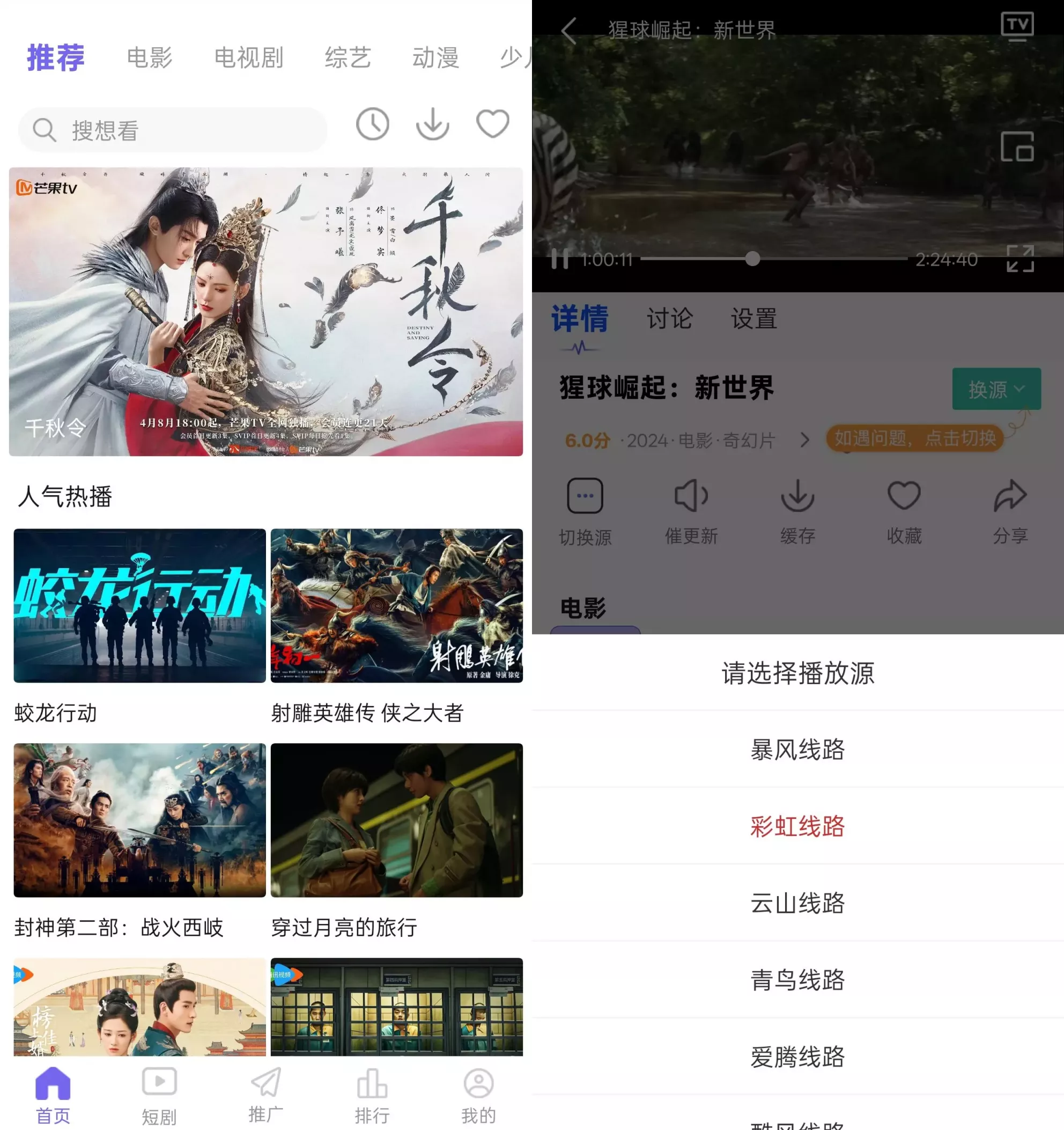观影时光软件的界面设计简洁明了,首页展示了搜索栏、推荐内容、分类标签等关键元素,方便用户快速找到想看的内容。点击某部影片后,即可进入详情页,查看影片的基本信息、播放源选择、收藏、分享等功能按钮,操作便捷无忧。此外,排行榜页还按时间周期和内容类型展示了热门影片榜单,让您随时掌握观影动态。