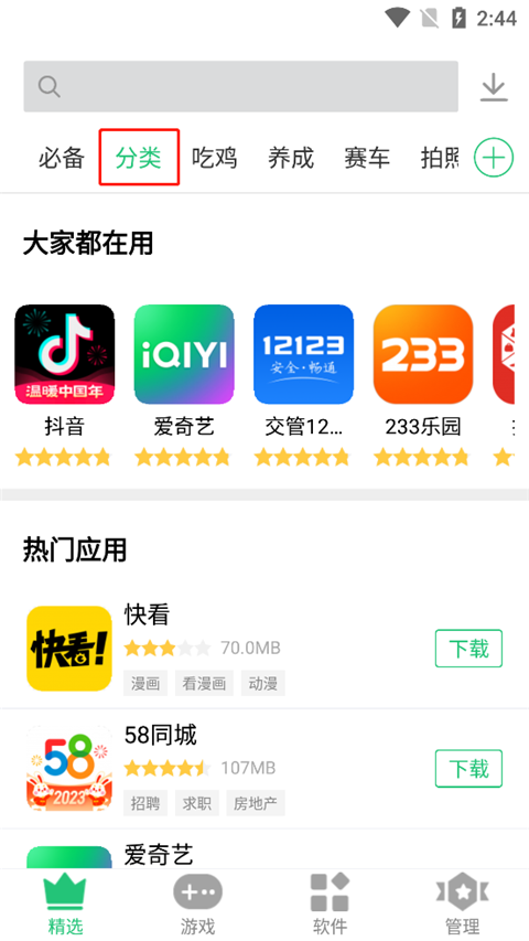 1、进入软件,在搜索框中输入你想要的应用,点击下载即可,如果不知道下载什么的话,可以点击分类;
