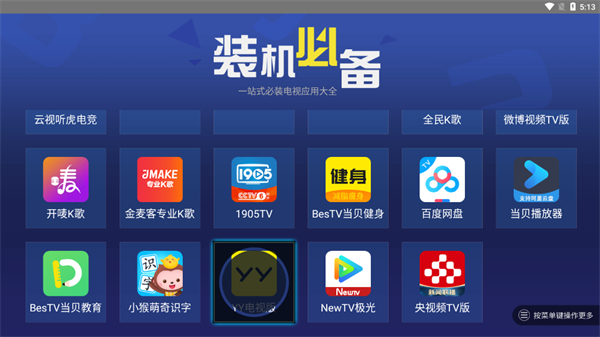 装机必备tv版最新版是一款针对智能电视的而开发研究的智能电视应用大全,软件收录了一站式必装智能电视应用,包括智能电视常用的当贝市场、vst全聚合、优酷xl、芒果tv、龙龙直播、电视家、一键加速等等,让用户可以找到最新最实用的看电视软件,无需再次下载。另外,装机必备tv版使用也很简单,遥控器直接点击即可轻松下载,让你安装精品应用更加方便快捷,同时该应用还可以每日精选出最好用的电视应用推荐给用户使用,这些应用都可以是使用遥控器进行点击操作,让大家在电视上找应用更加方便,对此,喜欢看电视的朋友不妨来本站下载试试看,相信一定不会让你失望的!