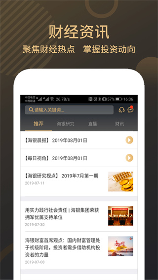 掌上海银app是海银财富旗下的优质金融理财咨询服务平台,为用户提供专业的理财咨询和财富管理,最新市场信息及时更新,还有市场跟踪让你快速了解行情,会员尊享和客服服务,为你答疑解惑。同时,针对于喜欢理财的用户,掌上海银内还精心汇集了海量优质的理财产品,还有最新全的财经资讯,让您随时随地都能及时掌握金融市场动向,还有资深的投顾人士为您指点迷津,帮助用户早日实现财富自由。软件亮点1、客户服务管理通过公司多渠道平台及时传递最新金融资讯市场最新信息、行业新闻、公司动态及时发布客户定期跟踪服务,提供合理化理财建议2、会员尊享服务会员专享活动、主流精英论坛、打造财富生活平台会员信息温馨提醒、节假日关怀会员专属的私人财务状况分析和资产配置建议3、呼叫中心服务提供专业的客户服务人员在线应答一站式服务快速解决客户疑问前端客户开拓与维护更新日志v5.5.4版本已知问题修复