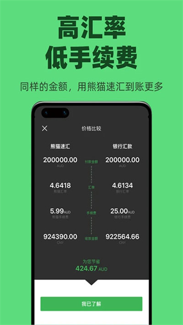 4.超优汇率:APP内可以实时跟踪汇款状态,真正实现即转即用!熊猫速汇让您动动手指就能汇款全球,我们没有线下门店,不但节约时间还节约成本,所以熊猫速汇提供了超优的汇率和超低的手续费,同样的汇款金额,用熊猫速汇到账更多。