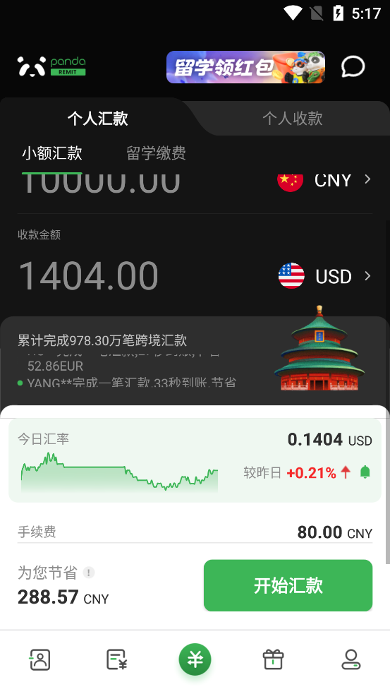 3.汇款类型:熊猫速汇满足您的各种汇款需求,不仅能够实现小额、大额汇款、国际汇款,同时还支持人民币汇出(人民币兑换美元/港币/欧元/澳元/加币等)、留学缴费(支持留学生支付海外学校的学费/生活费/报名费等,已覆盖全球28个国家/地区)