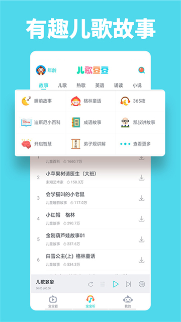 热门好听的儿歌童谣、哄睡音乐,经典有趣的睡前故事、安徒生童话故事、成语启蒙故事,还有古诗词朗诵、三字经百家姓等丰富的有声内容,给孩子更多想象的空间,激发宝宝求知探索的欲望。