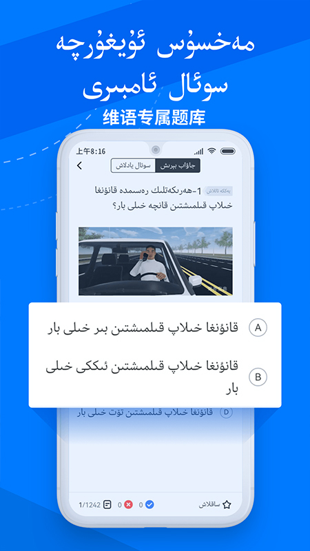 驾考宝典维语版是驾考宝典专为少数名族而推出的一款驾考app,这款应用为维语用户量身定制的小车题库,励志解决全国人民不同地区的学车需求。软件内的书写延续维语用法自右向左书写,并且同步至全国新版考试题库,支持全真模拟考试,科目一、科目四考试满分通过秘籍,并附带顺序、随机、专项等多种练习模式,既能帮助汉语不好的少数民族很好地理解驾驶证考核题目和内容,又发展并弘扬了少数民族优秀文化,实现共赢。同时,驾考宝典维语版也可以帮助用户快速熟练掌握每一个知识要点,更有模拟考试来熟悉考试的节奏和环境,让每个学员考试无忧。欢迎感兴趣的朋友前来本站免费下载。