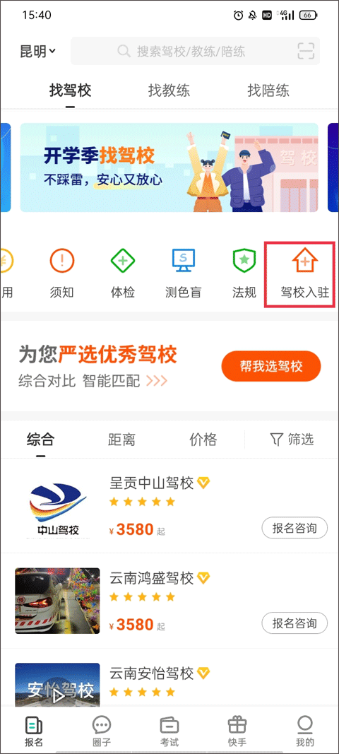 1、在【报名】这个界面中你可以看到费用、须知、体检、法规、驾校入驻等功能选项,点击“驾校入驻”。