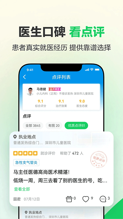 平台合作医院超25000家,提供专业医疗服务,可预约号源超过200万;千万优质患者评价,帮助用户找到好医生;专病医生榜单推荐,提供专业医患匹配;