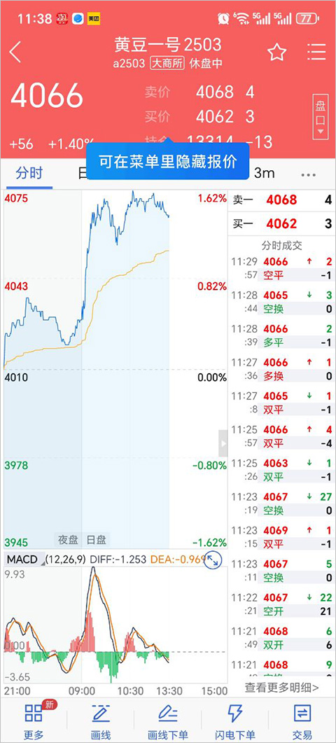 买一卖一数据放大:可在报价页面和行情数据栏将买一卖一数据进行放大,方便交易者实时盯盘观看。