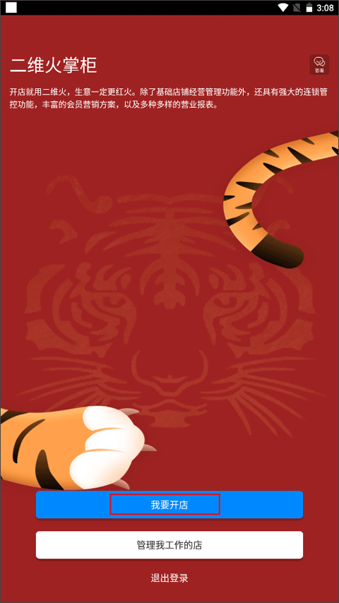 1、打开应用后,会显示两个功能选项:我要开店和管理我的店铺。点击我要开店。