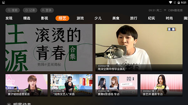 CIBN酷视频TV版也叫做酷燃视频TV版,它是由国广东方联合微博推出的一款可以安装在智能电视,智能机顶盒,投影仪等安卓系统的大屏幕上的短视频软件,在日常的生活中,无论是上下班途中还是在家里,几乎每一个人都是在低头刷短视频,短视频现在充满着每一个人的生活,那么除了在手机上刷短视频之外,在智能电视上也是可以观看精彩好看的短视频,CIBN酷视频TV版为观众提供了综艺、影视、旅游、幽默、美食、时尚、搞笑等众多分类的短视频,无论是你是喜欢追星还是喜欢烹饪,无论是小朋友还是老人,在这里都可以找到合适的短视频,除了娱乐还能学习到更多烹饪知识以及旅行攻略哦,并且软件还会根据用户的浏览习惯为用户推荐感兴趣的短视频。