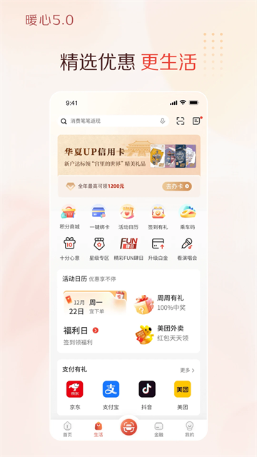 华彩生活App是华夏银行信用卡中心官方App,支持账单查询、实时及跨行还款、额度调整、灵活分期等操作,一应俱全。特别是视频客服和智能搜索,真正解决了“问题找不到人、信息搜不到”的痛点,在线就能完成大部分操作,省去了频繁跑网点的麻烦。华彩生活App内还可以直接参与演唱会抢票、美食拼单、观影优惠、影音会员充值、话费满减、出行加油优惠等活动,让信用卡的使用场景从“支付”扩展到“娱乐、出行、购物、生活”,几乎覆盖日常方方面面。