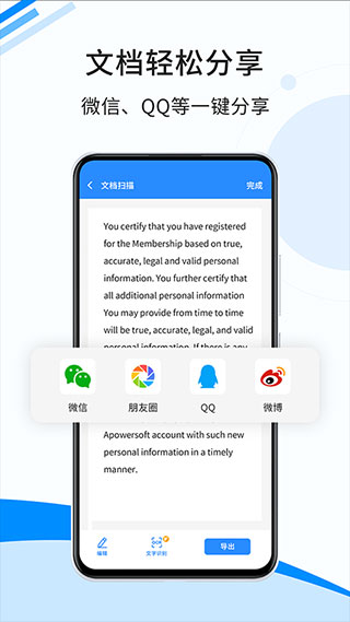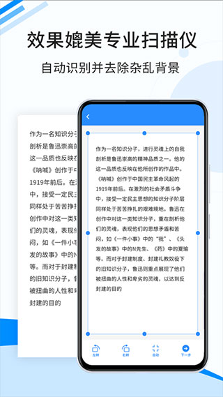 软件亮点1、智能扫描,精准识别使用手机摄像头,即可拍照扫描任意纸质文档、印刷或图形材料,拍照后软件进行自动扫描,智能识别周围环境、去除杂乱的背景、准确识别文本边框并转换为高清PDF或JPG图像文件。无需手动调整边框,彻底解放双手。2、文件扫描傲软扫描可以将合同、书籍、成绩单、学习笔记、试卷、演示文稿、论文、银行账单、票据/收据等各类文档进行拍照识别,并支持高清导出。3、证件扫描软件支持对身份证、护照、驾照、营业执照、毕业证等证件扫描,还可对身份证进行等比例拍照识别,自动生成A4标准扫描件,一步搞定身份证打印复印。4、图片文字识别傲软扫描借助OCR文字识别扫描技术,不仅支持图片转文字,还可以将图片转换为Word文档。将纸质资料内容进行拍照识字后,您可以导出Word格式和TXT格式、复制提取识别后的文段,或者预览图片并对识别后内容进行编辑后复制、导出。您也可以导入手机相册中的图片,进行图片文字提取。软件支持简繁体中文、英语、日语、韩语、法语、西班牙语、德语意大利语、葡萄牙语文字识别,多语言文件也能轻松搞定!更新日志v2.0.9版本修复部分小错误,提升整体稳定性。