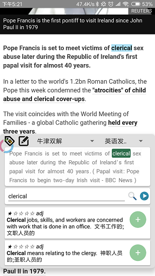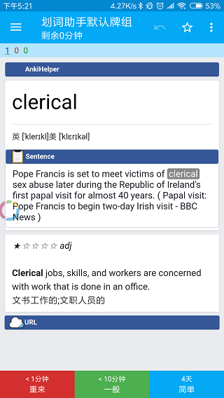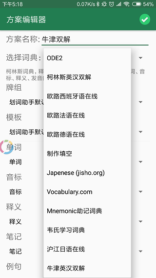 Anki划词助手是一款非常实用的英语学习翻译软件,当你在学习英语遇时遇到生词,可以将其快速划词选出,并进行翻译。软件支持多个词典共同翻译,其中包括新牛津双解,柯林斯双解,西班牙语在线等等,并且支持多词典在线切换翻译,同时内置高达数10万单词量,可以轻松对各类专业名词、熟词僻义、短语。多义词进行翻译。Anki划词助手需要配合卡片记忆软件AnkiDroid组合实用,他可以在你查询英语文本中的生词,并将单词所在的句子、音标、解释等信息快速导入到AnkiDroid中,并生单词卡片。一键制卡,消除繁琐的生词卡记录流程,帮助用户很好地记忆生词。