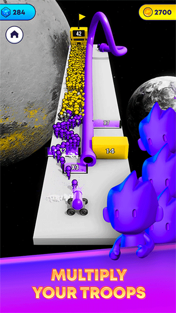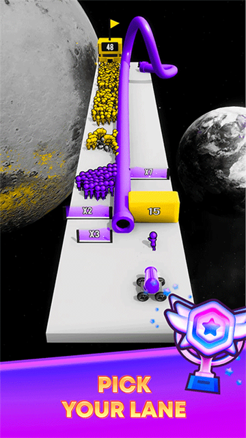 炮弹人冲冲冲手游是一款竖屏版的快节奏休闲游戏,又被广大网友称作“暴民控制”,画面风格清新简单,游戏关卡非常丰富,并采用了标准的上帝视角,令玩家体验不一样的闯关类游戏。该作采用了类似简化版即时战斗玩法的模式,让玩家控制蓝色火柴人与电脑展开对抗,颇为巧妙的是,创造性加入了倍增门槛,让兵力产生的过程更加充满意外。玩家进入游戏后,需要不断的派遣小兵攻占敌方塔楼,经过蓝色大门人数翻倍!避开红色的大门,谨慎选择你的派兵路径。除此之外:玩家在炮弹人冲冲冲手游中还可以选择不同大炮、怪物和斗士,增强作战时的战力,期间你还能通过升级来提升大炮、怪物和斗士们的威力,甚至还能通过升级速度和巨大体型,快速赢下比赛的胜利,可玩性极高。你能招募多少人马?在游戏中才能知晓。
