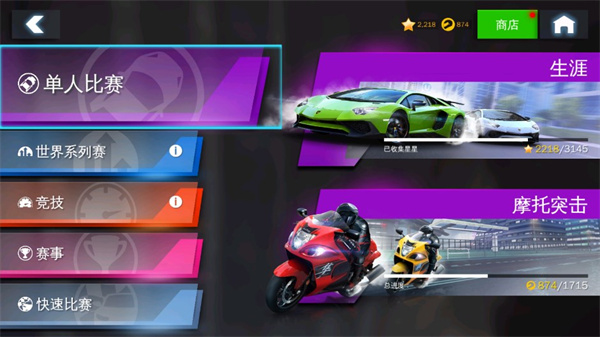 狂野飙车8国际版是一款特效逼真的3D赛车手游,也是Gameloft开发的狂野飙车系列第8部作品,相比于前作画面和玩法上都有重大的飞跃,是各位玩家不可错过的经典。游戏内的赛道地图以世界各地不同的都市为蓝本打造,游戏将有全新8幅地图,新场景中将含有逼真的雪、灰尘和雨水等天气变化系统,画面效果超乎想象,还带有全新特效,绝对带给你全新的游戏体验。游戏含异步和同步多人模式,并且在传统的 《狂野飙车》系列赛事基础上,还新增了“漂移穿越”和“伤害传染”两种模式,前者利用漂移加速冲过计分点来完成比分,后者则要通过频繁撞击将伤害转移给对手车辆。此外游戏还为大家提供了数十辆梦幻级的跑车,包括法拉利、兰博基尼、奥迪以及杜卡迪等,你可以开着赛车自由的漂移、飞驰,与各种各样的玩家进行赛车比赛,当玩家驾驶着赛车左右漂移向前冲刺的时候,可以收集一路上的氮气,加速超越你的对手,每一次完成比赛都可以获得大量的奖金,十分刺激。