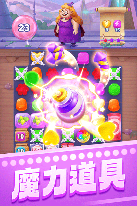 三个女巫一台戏,要么射出几个小怪兽,要么赐予几颗硬糖,要么冰冻某些糖果,总之她们会想尽一切办法,不让你安宁,唯一的办法就是你必须尽快的消灭她们