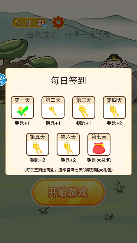 1、进入游戏,每天签到都可以获得钥匙,钥匙会让你在挑战的时候获得提示