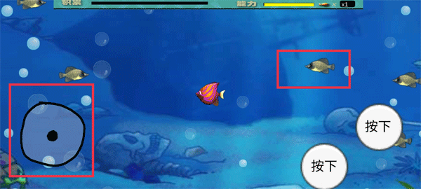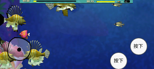3、通过触屏操控小鱼移动,过程中碰到比自己小的鱼即可吃掉对方。