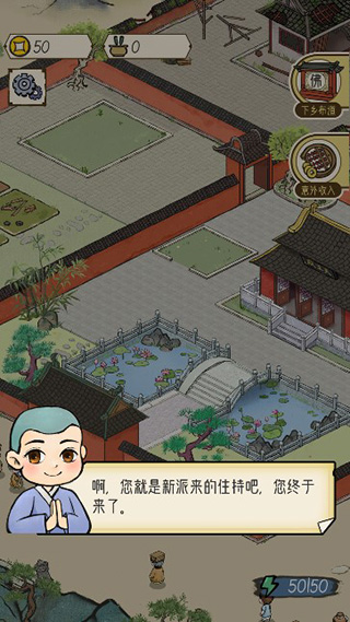 4、开启化缘—下山化缘,便有机会获得丰富的道具和相关事件,从而更好的建设寺庙。