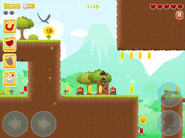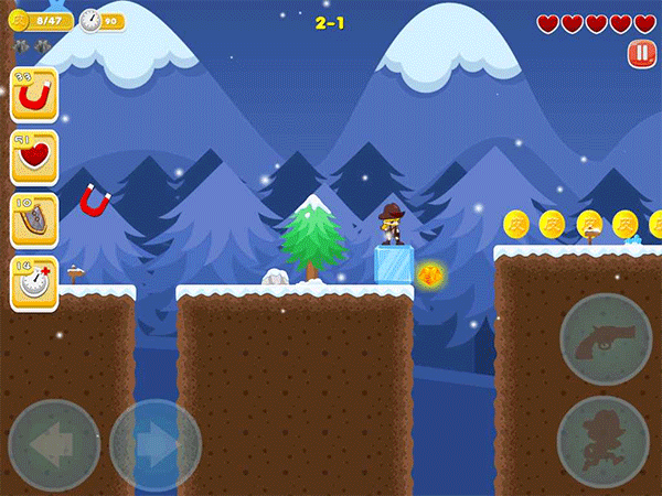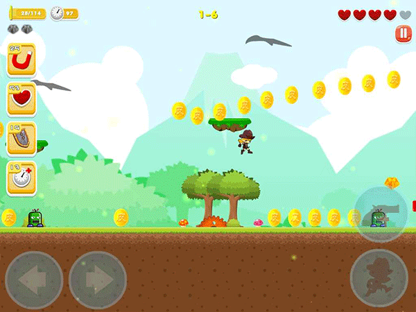 另外游戏操作方式还是非常简单的,只有左右和跳跃三个按键,玩家需要在游戏中控制一个角色,操控他们移动跳跃,在躲避障碍物的同时还要收集金币。并且游戏内还支持几十个成就,以及多种的道具帮助你更加顺利的通关哦。