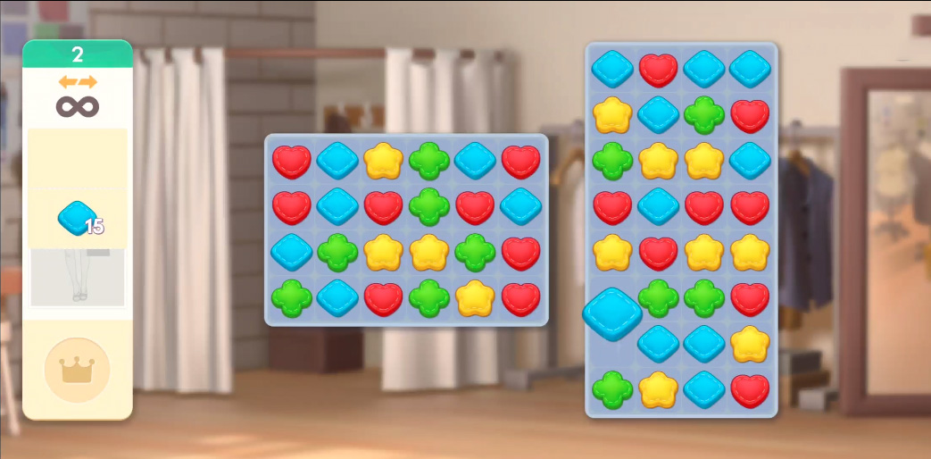 这是Project Makeover的核心玩法。你需要在每个关卡中解决一系列糖果粉碎式的谜题。通过交换相邻的游戏片块,你需要在限定步数内,创建至少三个相同图块的组合以清除它们,达成关卡目标。