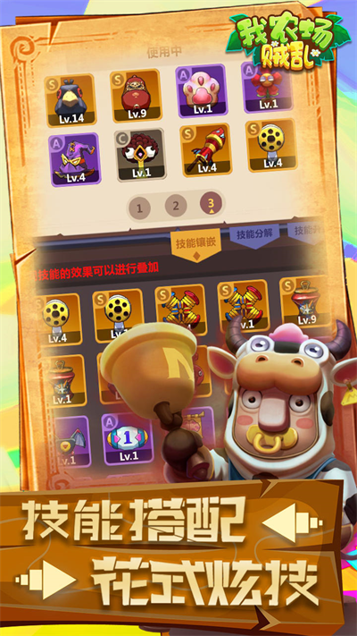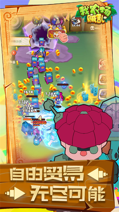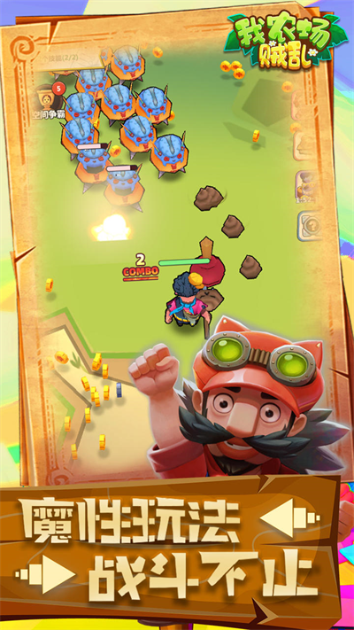 我农场贼乱是一款卡通风格十足的战斗冒险手游,游戏中的设定是作为玩家我们要扮演游戏的农场主,抵御许多奇特生物入侵农场,以此来保护农场的安全,听着有点像植物大战僵尸,不过那个是分配植物抵御僵尸,这个则是要一骑当千来抵挡敌人的入侵。在我农场贼乱无限钻石最新版游戏中,需要不断收集资源道具,以此来增强自己的实力,保证自己能够存活的同时还能保护农场的安全,算是一款较为不错的轻度休闲游戏。