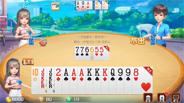 将三张底牌交给地主,并亮出底牌让所有人都能看到。地主首先出牌,然后按逆时针顺序依次出牌,轮到用户跟牌时,用户可以选择 “ 不出 ” 或出比上一个玩家大的牌。某一玩家出完牌时结束本盘。
